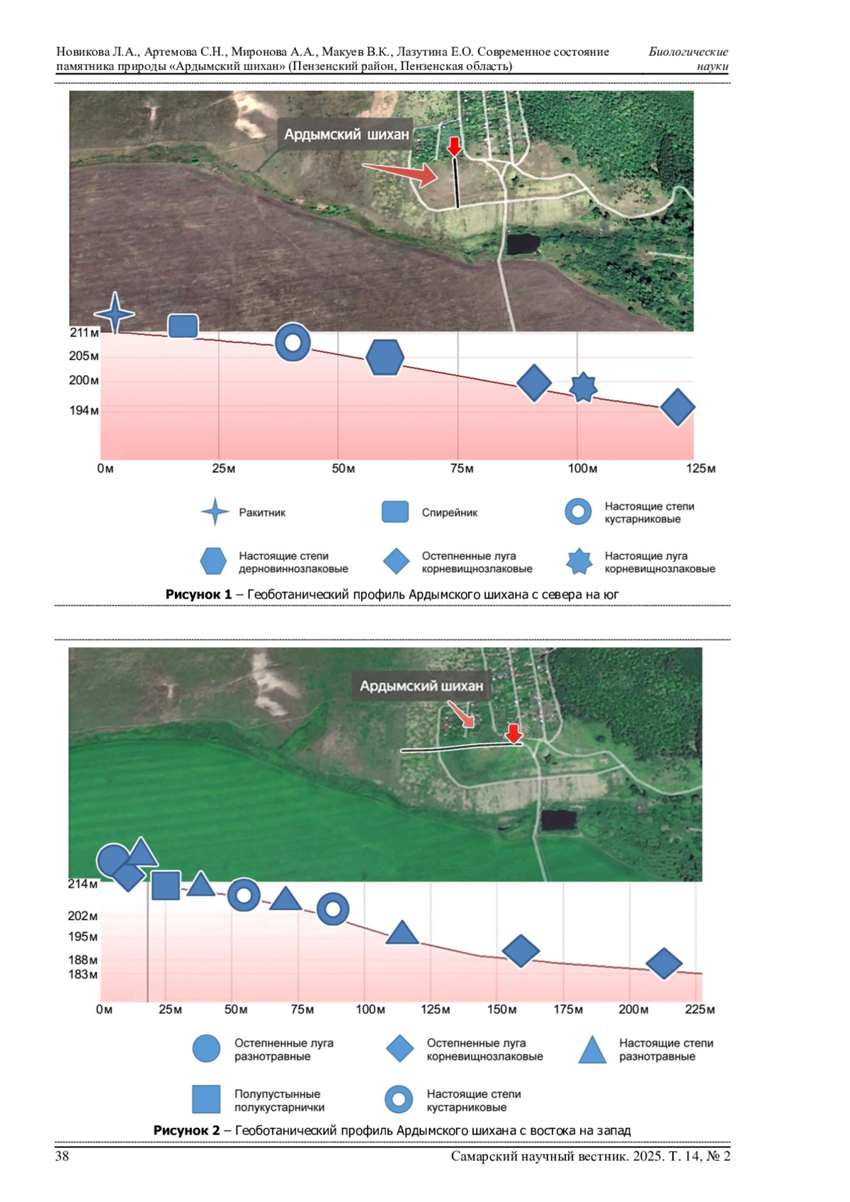 Актуальность изучения состоит в мониторинге растительности очень ценного ботанического памятника природы Пензенской области «Ардымский шихан. Динамика растительности изучалась методом геоботанического профилирования (2001-2022 гг.). Описание пробных площадей проводилось традиционным способом. Всего было сделано 55 фитоценотических описаний и разработана эколого-фитоценотическая классификация растительности на доминантной основе. Геоморфологический анализ проводился с использованием данных дистанционного зондирования Земли (ДЗЗ) и полевых ландшафтных исследований. В итоге отмечается, что в условиях заповедного режима за 20 лет отмечается значительное возрастание полукустарничков ( Krascheninnikovia ceratoides (L.) Gueldenst. и Ephedra distachya L.) Настоящие степи на вершине и склонах южной и юго-западной экспозиции сменились полукустарничками, а на склонах восточной и западной экспозиции - остепненными лугами. Важно отметить, что дерновинно-злаковые настоящие степи сменились на склонах восточной и западной экспозиции разнотравными вариантами, а на вершине и склонах южной и юго-западной экспозиции - кустарниковыми. Луговые степи практически не поменяли своего участия, но появилась луговая растительность, причем на склонах восточной и западной экспозиции в основном остепненные луга, а в ложбинах и подножьях склонов - настоящие луга.