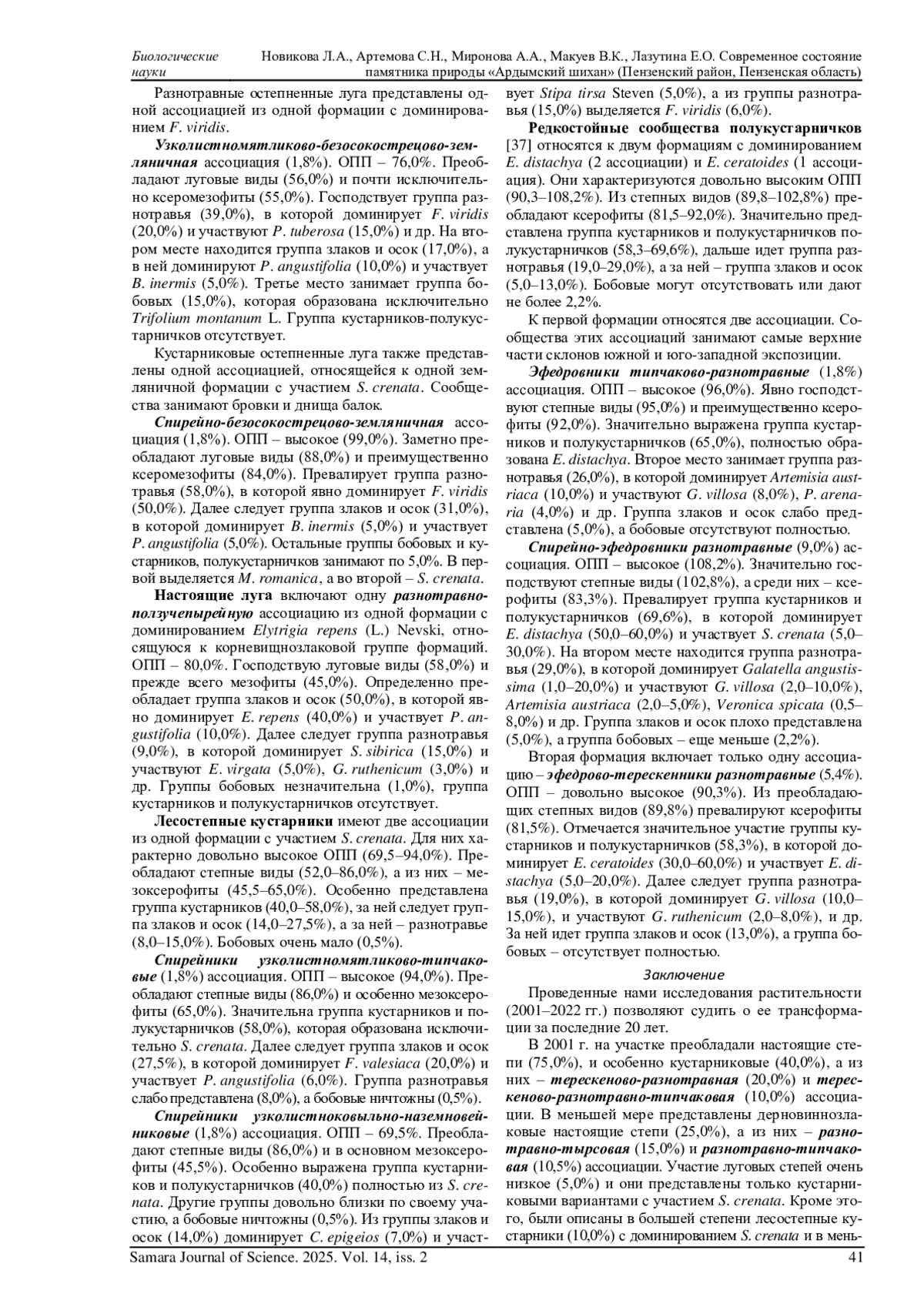 11. 	Новикова Л.А. Мониторинг травяного компонента “Островцовской лесостепи” // Известия Самарского научного центра Российской академии наук. 2004. Спецвыпуск “Природное наследие России”. Ч. 2. С. 294-305.