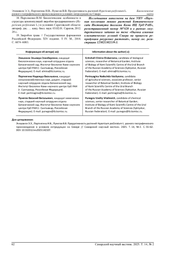16. 	Эчишвили Э.Э., Пунегов В.В., Мишуров В.П., Портнягина Н.В. Ресурсная характеристика Hypericum perforatum (Hypericaceae) в условиях интродукции (Республика Коми) // Растительные ресурсы. 2009. Т. 45, вып. 2. С. 48-57. EDN: OIJFNZ