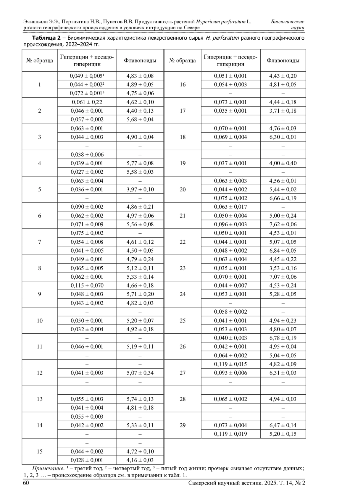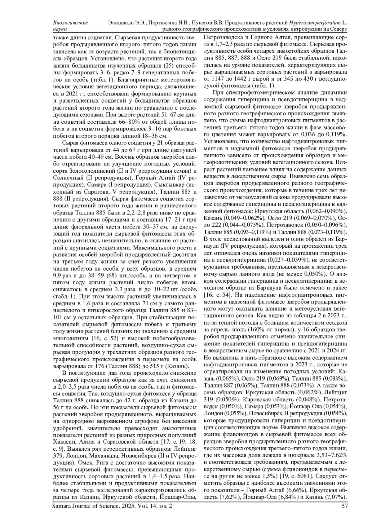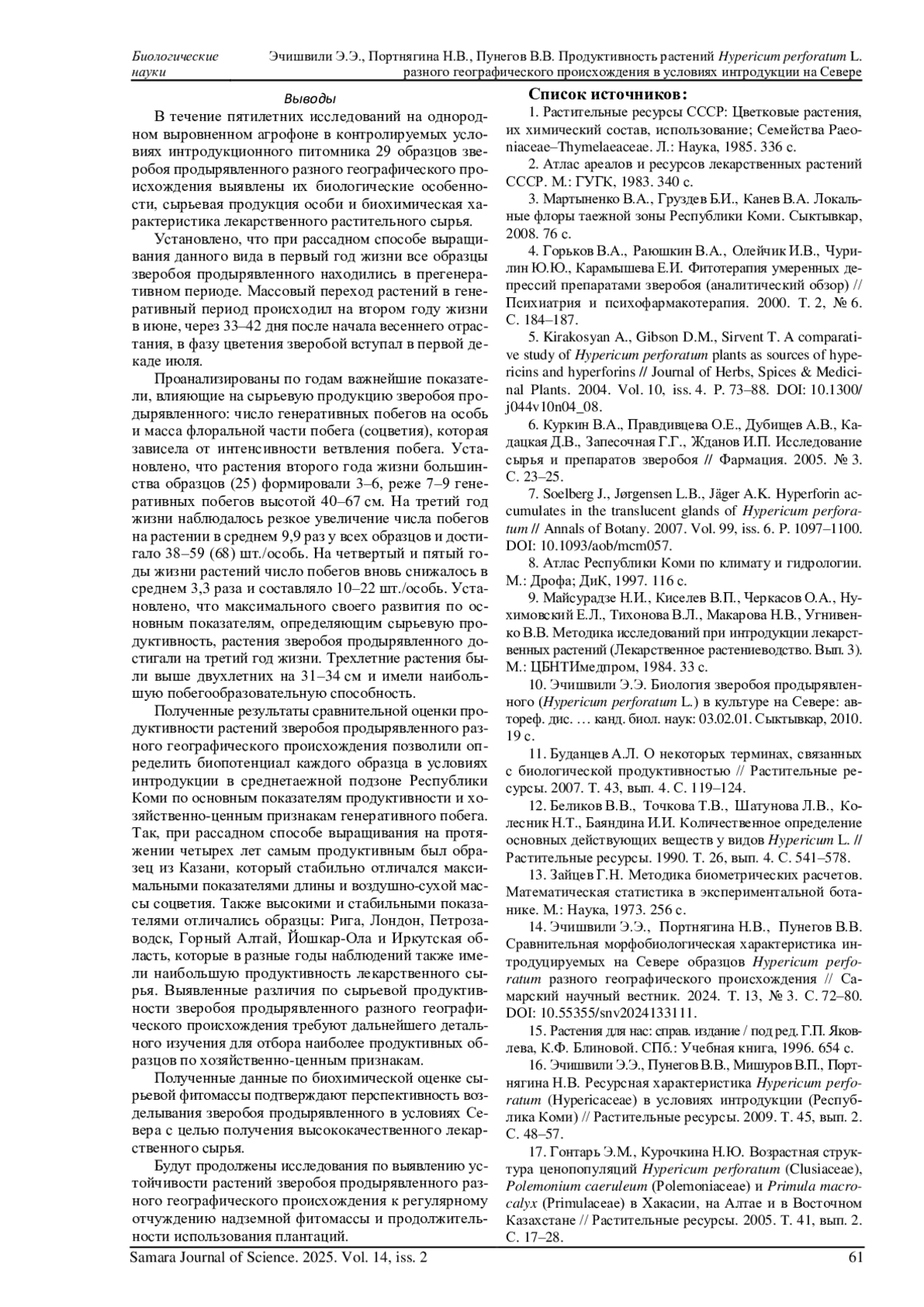 14. 	Эчишвили Э.Э., Портнягина Н.В., Пунегов В.В. Сравнительная морфобиологическая характеристика интродуцируемых на Севере образцов Hypericum perforatum разного географического происхождения // Самарский научный вестник. 2024. Т. 13, № 3. С. 72-80. DOI: 10.55355/snv2024133111 EDN: DOALWY