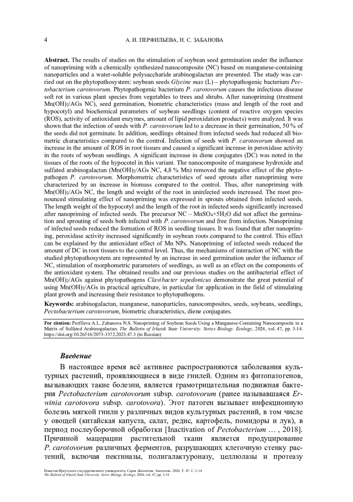 Представлены результаты исследований по изучению стимуляции прорастания семян сои Glycine max (L.) под влиянием нанопрайминга химически синтезированным нанокомпозитом (НК) на основе марганецсодержащих наночастиц и водорастворимого полисахарида арабиногалактана. Изучено влияние нанокомпозита гидрооксида марганца и сульфатированного арабиногалактана (НК Mn(OH)2/AГс, 4,8 % Mn) на всхожесть, биометрические характеристики (масса и длина корня и гипокотиля) и биохимические показатели (содержание активных форм кислорода, активность антиоксидантных ферментов, количество продуктов перекисного окисления липидов) проростков семян сои, инфицированных фитопатогеном Pectobacterium carotovorum. Обсуждаются перспективы использования нанокомпозита Mn(OH)2/AГс для ростостимуляции культурных растений и повышения сопротивляемости фитопатогенам.
