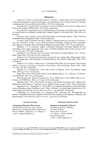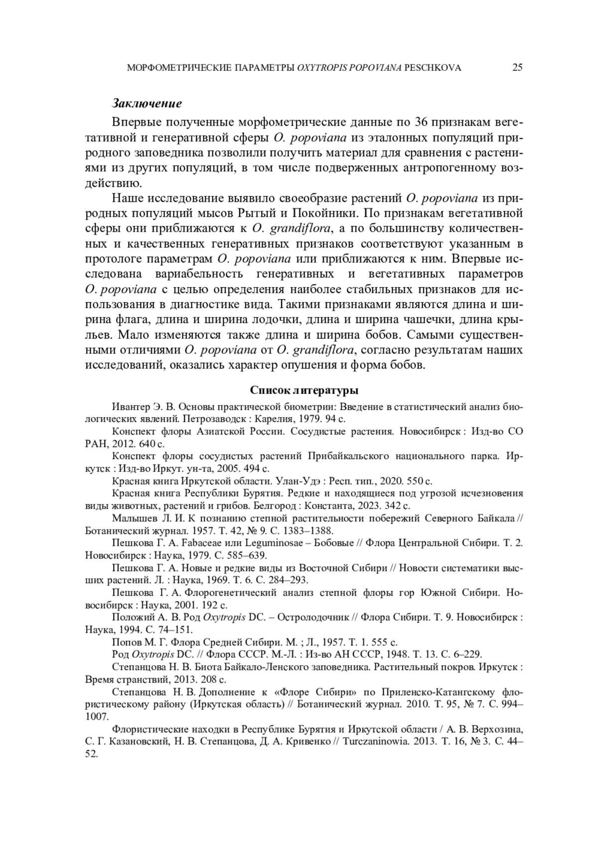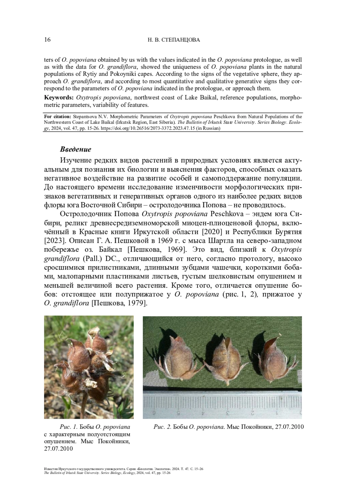 СТЕПАНЦОВА Н. В. МОРФОМЕТРИЧЕСКИЕ ПАРАМЕТРЫ OXYTROPIS POPOVIANA PESCHKOVA ИЗ ПРИРОДНЫХ ПОПУЛЯЦИЙ СЕВЕРО-ЗАПАДНОГО ПОБЕРЕЖЬЯ ОЗЕРА БАЙКАЛ (ИРКУТСКАЯ ОБЛАСТЬ) // ИЗВЕСТИЯ ИРКУТСКОГО ГОСУДАРСТВЕННОГО УНИВЕРСИТЕТА. СЕРИЯ: БИОЛОГИЯ. ЭКОЛОГИЯ. 2024. ТОМ 47
