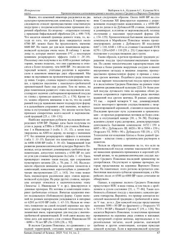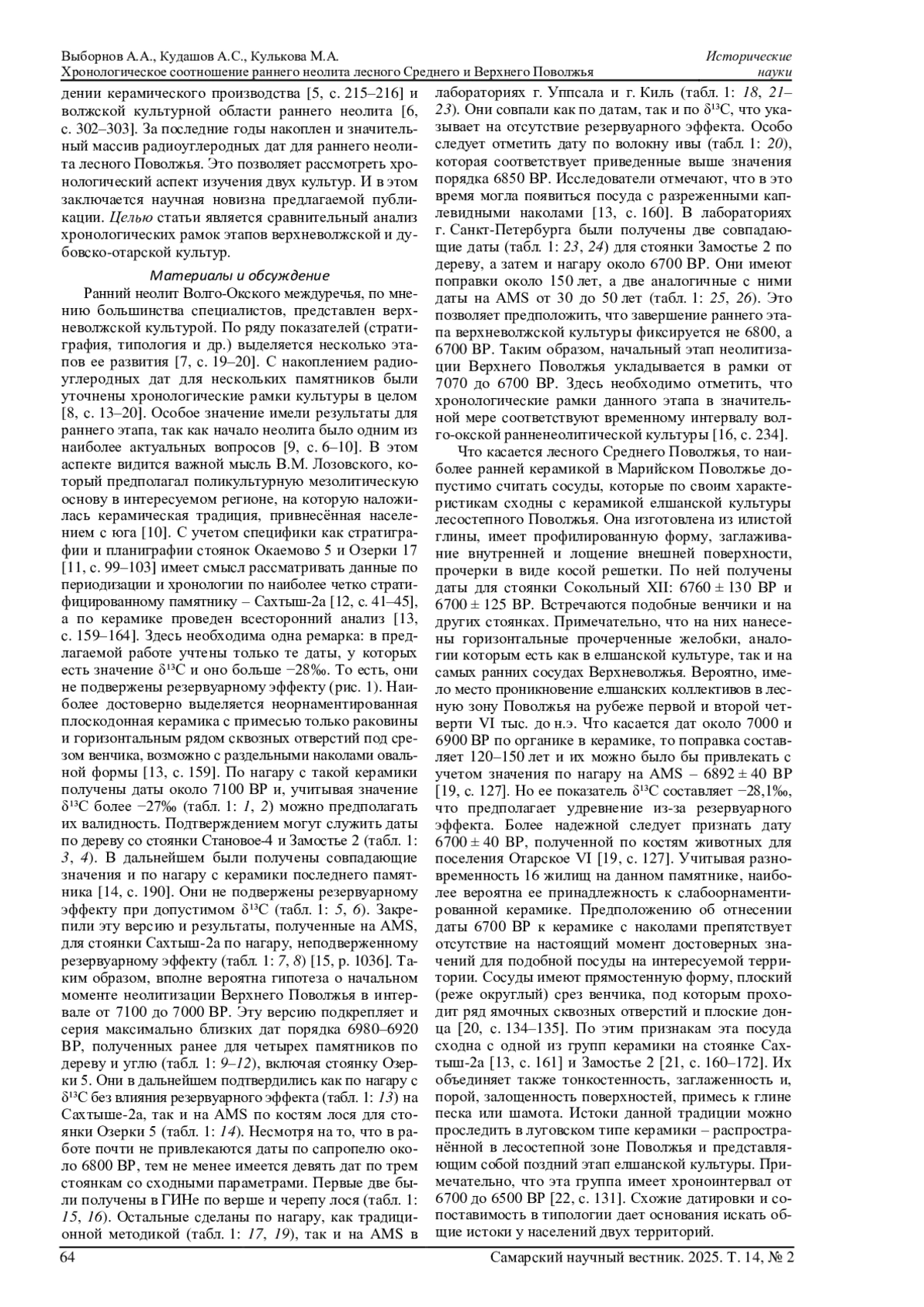 В статье рассматривается вопрос хронологии и содержания этапов раннего неолита Верхнего и лесного Среднего Поволжья. Учитывались наиболее валидные радиоуглеродные даты, полученные по углю, костям животных и нагару, имеющие невысокий показатель δ¹³C. Раннему этапу верхневолжской (волго-окской) культуры соответствуют определениям конца VII - первой трети VI тыс. до н. э. В лесном Среднем Поволжье значения свидетельствуют о неолитизации около 6800 BP при импульсе от елшанской культуры. В сравниваемых регионах наибольшие сходства отмечаются в начальный период. С 6500 лет BP в верхневолжской культуре развиваются накольчатая и зубчатая традиции орнаментации. В Марийские леса около этого рубежа проникают носители керамики с подтреугольными/подовальными наколами. Зубчатая и пунктирная техники в дубовско-отарской культуре не представлены. В верхневолжской среде с 6300 BP появляется гребенчатый, прочерченный и ямочный, включая белемнитный, орнамент завершающего этапа раннего неолита. В лесном Среднем Поволжье до начала V тыс. до н. э. существует накольчатая традиция вплоть до контактов с льяловской и камской культурами. Можно заключить о различающихся хронологических и содержательных этапах в раннем неолите двух регионов.