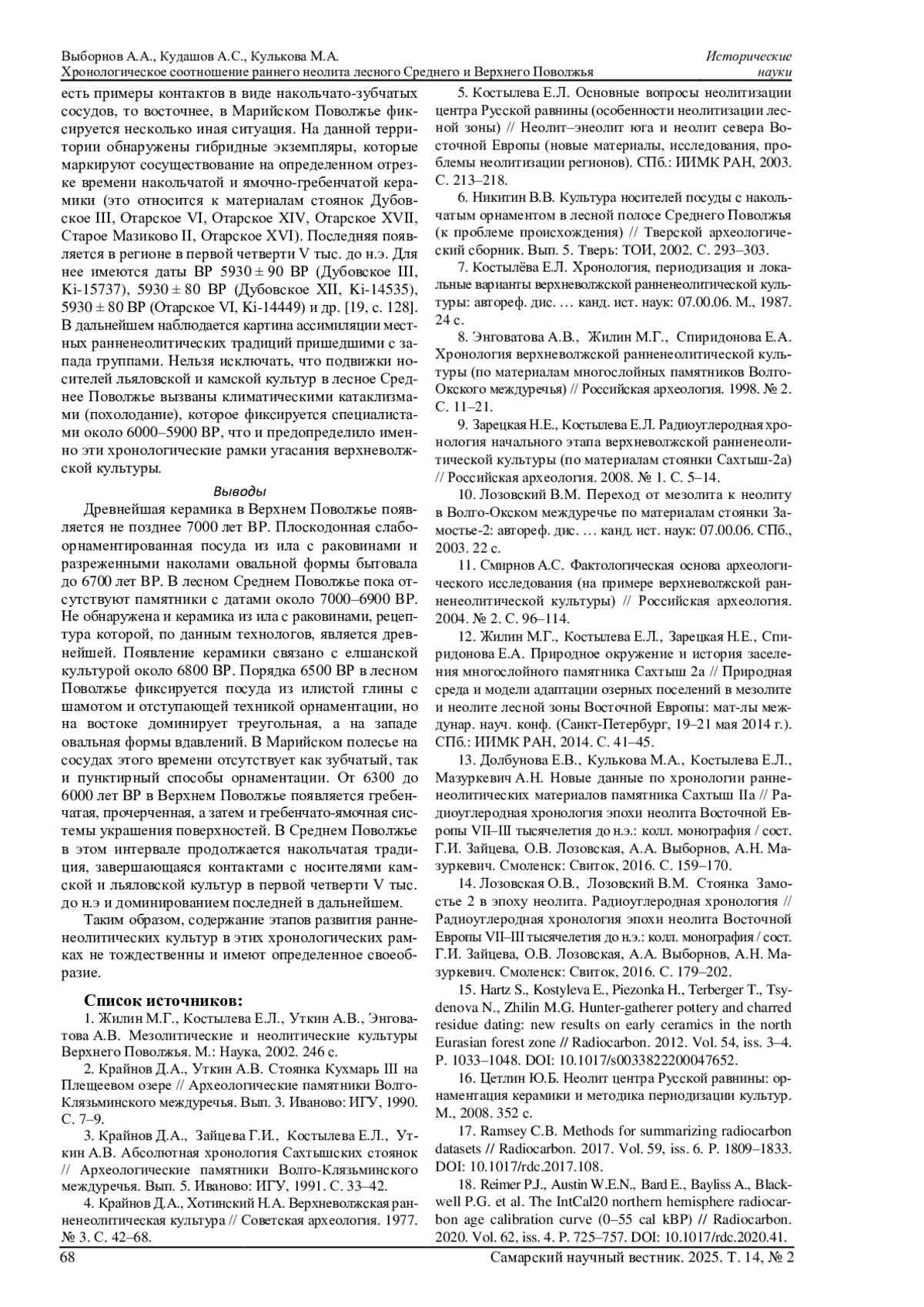 24. 	Цветкова Н.А. Начало неолитической эпохи на Верхней Волге // Вестник Санкт-Петербургского университета. История. 2019. Т. 64, вып. 2. С. 683-717. DOI: 10.21638/11701/spbu02.2019.215 EDN: IOLWGL