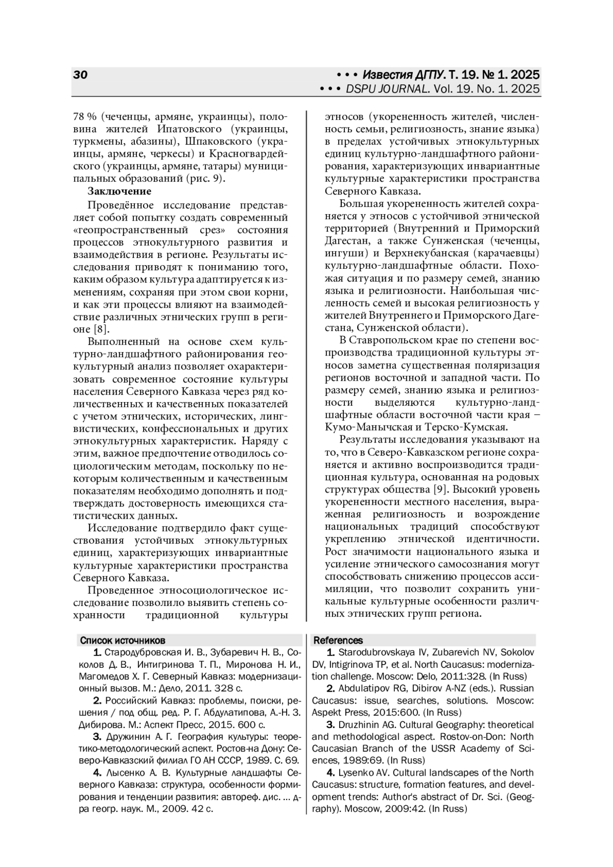 Цели - выявление традиционных инвариантных элементов структуры современных культурных ландшафтов Северного Кавказа; определение степени сохранности ментальных и бытовых компонентов традиционной культуры и степени их трансформации в условиях интенсивного межэтнического взаимодействия. Методы. Актуальные исследования региона осуществлялись с помощью группы методов: социологических, картографических, статистических. В особенности применялся социологический метод, поскольку по ряду критериев необходимо было дополнить и подтвердить достоверность статистических данных. Анализ особенностей развития культурных ландшафтов Северного Кавказа проводился на основе схемы культурно-ландшафтного районирования. Он позволяет охарактеризовать их современное состояние через ряд количественных и качественных показателей с учетом этнических, исторических, лингвистических, конфессиональных и других этнокультурных характеристик. Результаты. Исследование направлено на изучение сохранности традиционных элементов культурных ландшафтов и степени вовлеченности разных этнических групп в современные инновационные этнокультурные процессы. С этой целью были проанализированы количественные и качественные показатели, отражающие текущие этнокультурные изменения на Северном Кавказе, позволяющие понять, как трансформируются культурные ландшафты региона в современных реалиях. Выводы. Исследование показывает, что в Северо-Кавказском регионе продолжает сохраняться и развиваться традиционная культура, базирующаяся на семейных и родственных связях. Глубокая привязанность жителей к своей местности, высокая степень религиозности и возрождение народных обычаев укрепляют чувство принадлежности к своему народу. Повышение роли родного языка и рост осознания собственной этничности способны замедлить процессы культурной интеграции, способствуя сохранению самобытных культурных черт различных народов региона.