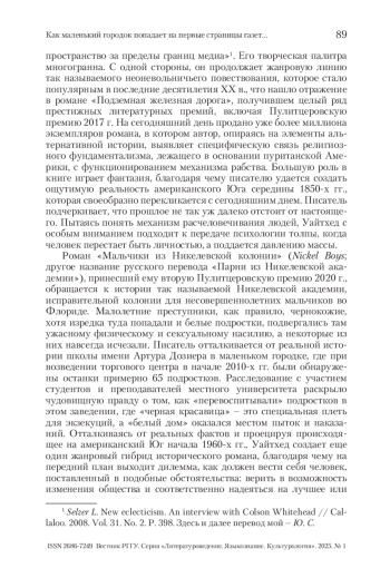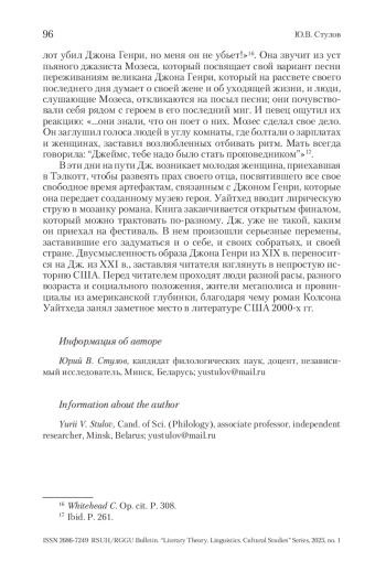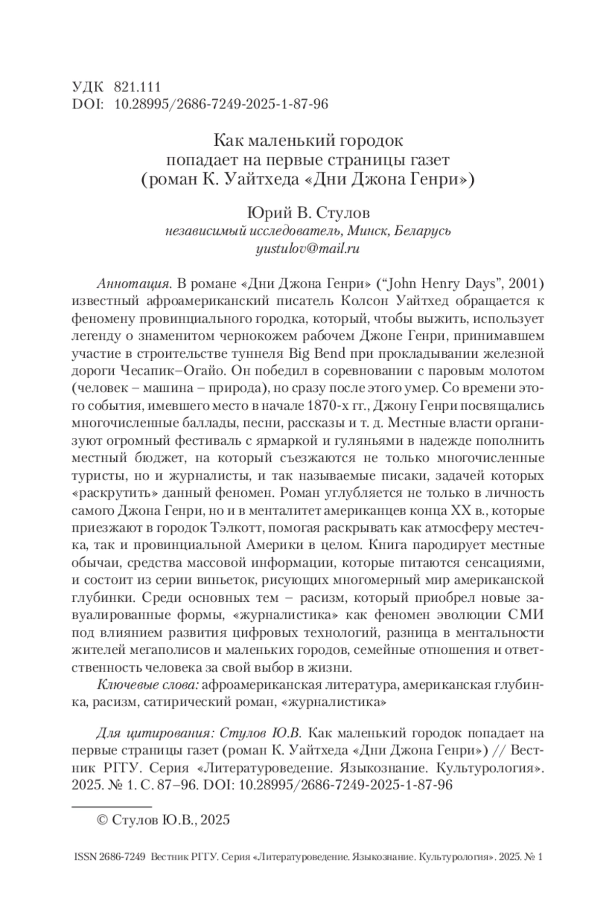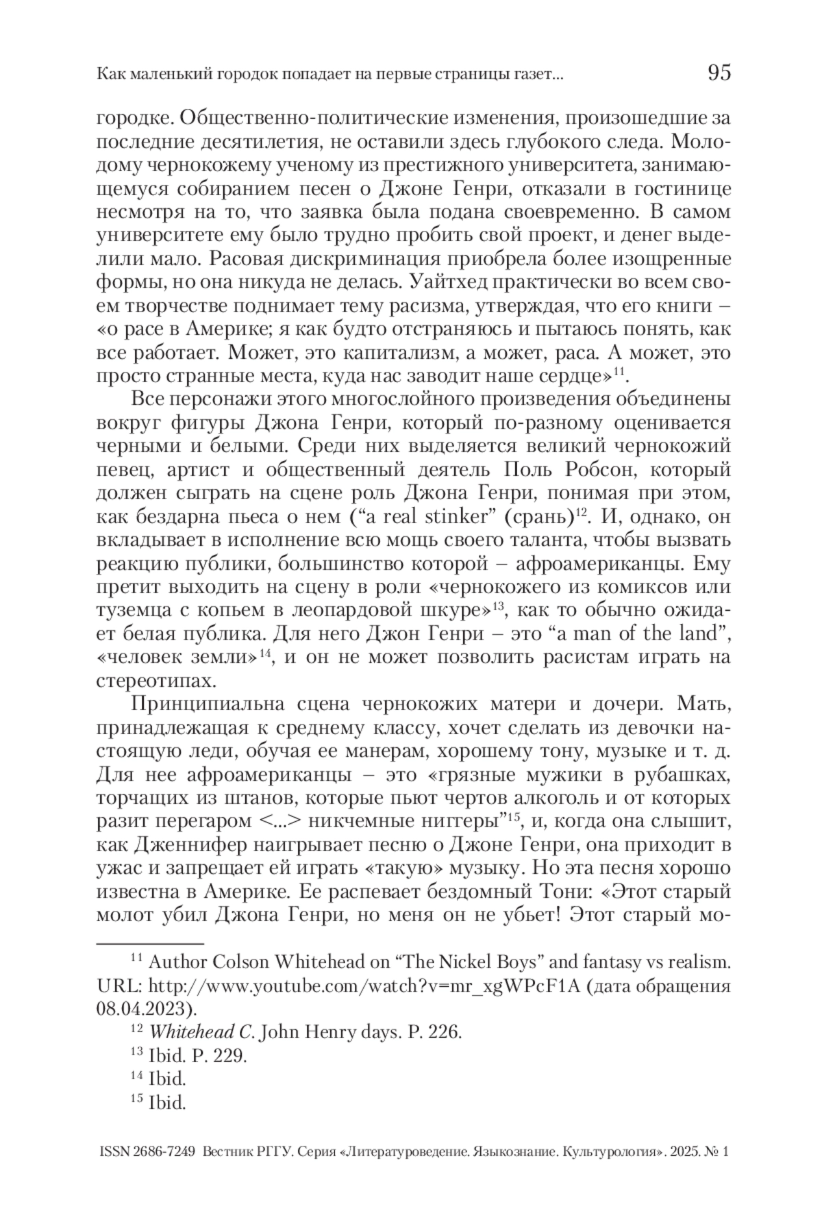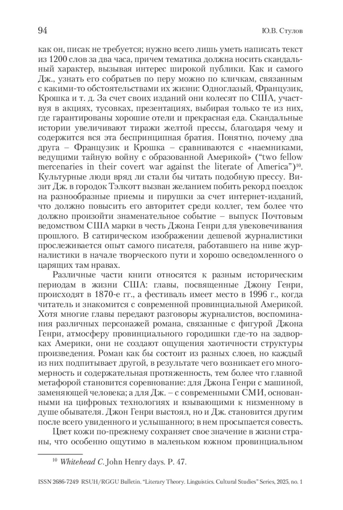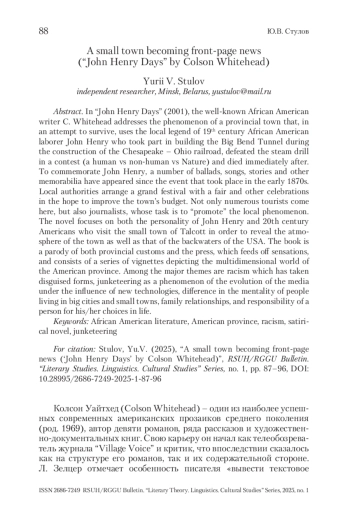В романе «Дни Джона Генри» (“John Henry Days”, 2001) известный афроамериканский писатель Колсон Уайтхед обращается к феномену провинциального городка, который, чтобы выжить, использует легенду о знаменитом чернокожем рабочем Джоне Генри, принимавшем участие в строительстве туннеля Big Bend при прокладывании железной дороги Чесапик–Огайо. Он победил в соревновании с паровым молотом (человек – машина – природа), но сразу после этого умер. Со времени этого события, имевшего место в начале 1870-х гг., Джону Генри посвящались многочисленные баллады, песни, рассказы и т. д. Местные власти организуют огромный фестиваль с ярмаркой и гуляньями в надежде пополнить местный бюджет, на который съезжаются не только многочисленные туристы, но и журналисты, и так называемые писаки, задачей которых «раскрутить» данный феномен. Роман углубляется не только в личность самого Джона Генри, но и в менталитет американцев конца ХХ в., которые приезжают в городок Тэлкотт, помогая раскрывать как атмосферу местечка, так и провинциальной Америки в целом. Книга пародирует местные обычаи, средства массовой информации, которые питаются сенсациями, и состоит из серии виньеток, рисующих многомерный мир американской глубинки. Среди основных тем – расизм, который приобрел новые завуалированные формы, «журналистика» как феномен эволюции СМИ под влиянием развития цифровых технологий, разница в ментальности жителей мегаполисов и маленьких городов, семейные отношения и ответственность человека за свой выбор в жизни.