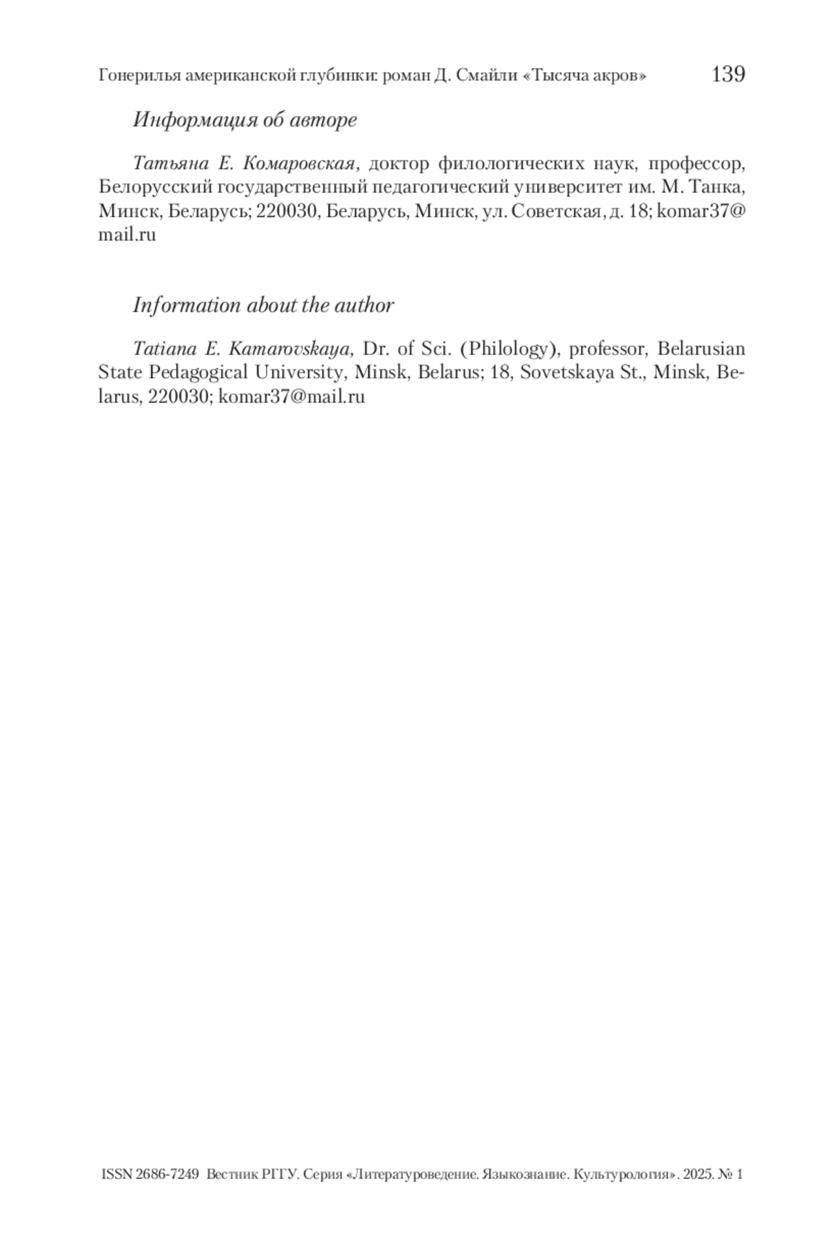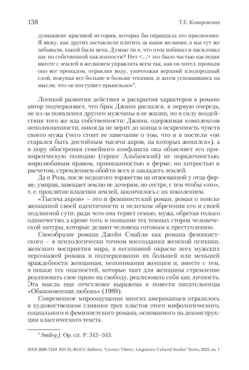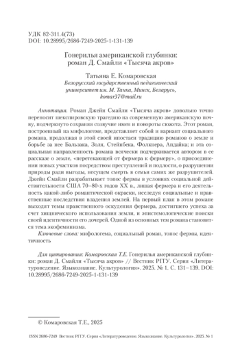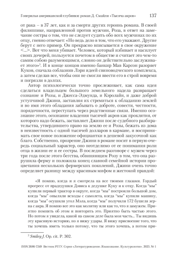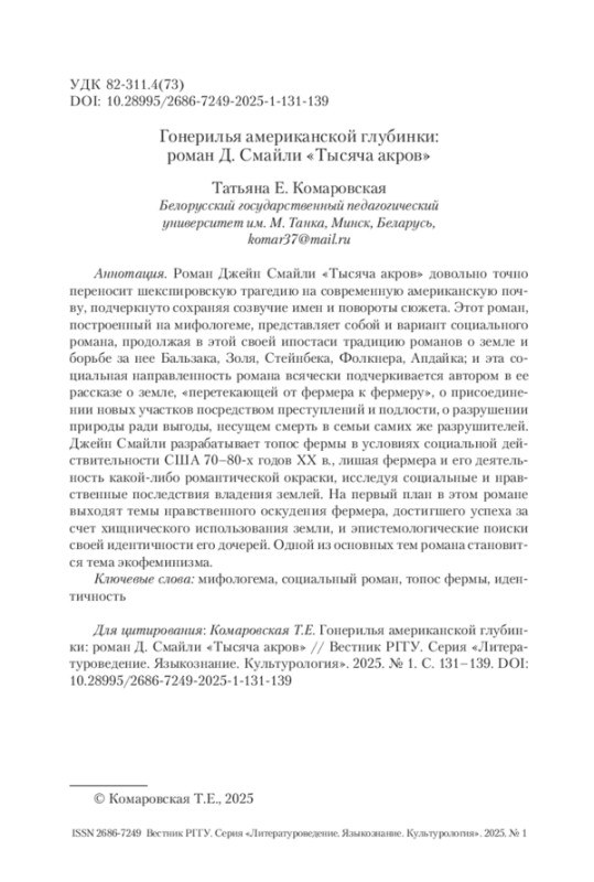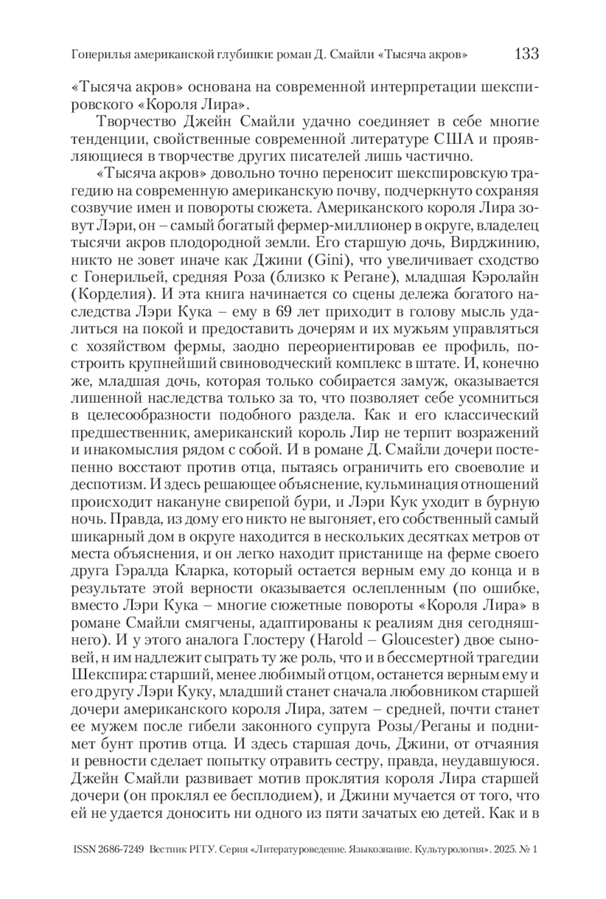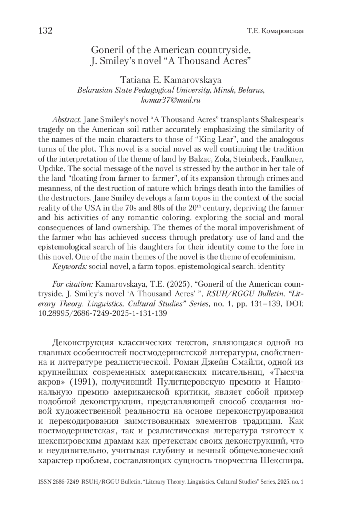 Роман Джейн Смайли «Тысяча акров» довольно точно переносит шекспировскую трагедию на современную американскую почву, подчеркнуто сохраняя созвучие имен и повороты сюжета. Этот роман, построенный на мифологеме, представляет собой и вариант социального романа, продолжая в этой своей ипостаси традицию романов о земле и борьбе за нее Бальзака, Золя, Стейнбека, Фолкнера, Апдайка; и эта социальная направленность романа всячески подчеркивается автором в ее рассказе о земле, «перетекающей от фермера к фермеру», о присоединении новых участков посредством преступлений и подлости, о разрушении природы ради выгоды, несущем смерть в семьи самих же разрушителей. Джейн Смайли разрабатывает топос фермы в условиях социальной действительности США 70–80-х годов ХХ в., лишая фермера и его деятельность какой-либо романтической окраски, исследуя социальные и нравственные последствия владения землей. На первый план в этом романе выходят темы нравственного оскудения фермера, достигшего успеха за счет хищнического использования земли, и эпистемологические поиски своей идентичности его дочерей. Одной из основных тем романа становится тема экофеминизма.