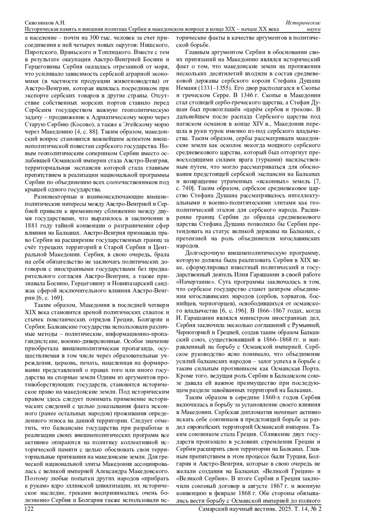 СКВОЗНИКОВ А. Н. ИСТОРИЧЕСКАЯ ПАМЯТЬ И ВНЕШНЯЯ ПОЛИТИКА СЕРБИИ В МАКЕДОНСКОМ ВОПРОСЕ В КОНЦЕ XIX - НАЧАЛЕ XX ВЕКА // САМАРСКИЙ НАУЧНЫЙ ВЕСТНИК. 2025. ТОМ 14, № 2