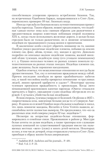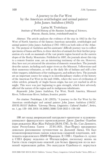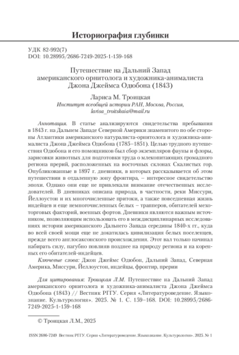 В статье анализируются свидетельства пребывания в 1843 г. на Дальнем Западе Северной Америки знаменитого по обе стороны Атлантики американского натуралиста-орнитолога и художника-анималиста Джона Джеймса Одюбона (1785–1851). Целью трудного путешествия Одюбона и его помощников был сбор экземпляров фауны и флоры, зарисовки животных для подготовки труда о млекопитающих громадного региона прерий, расположенных на восточных склонах Скалистых гор. Опубликованные в 1897 г. дневники, в которых рассказывается об этом путешествии в отдаленную зону фронтира, – интересное свидетельство эпохи. Однако они еще не привлекали внимание отечественных исследователей. В дневниках описана природа, в частности, реки Миссури, Йеллоустон и их многочисленные притоки, а также повседневная жизнь индейцев и еще немногочисленных белых – трапперов, обитателей мехоторговых факторий, военных фортов. Дневники являются важным источником, позволяющим использовать его в междисциплинарных исследованиях истории американского Дальнего Запада середины 1840-х гг., куда во всей своей мощи еще не докатилась цивилизация белых поселенцев, прежде всего англосаксонского происхождения. Этот вал только начинал набирать силу, пагубно повлияв позднее на природу региона и на коренных его обитателей-индейцев.