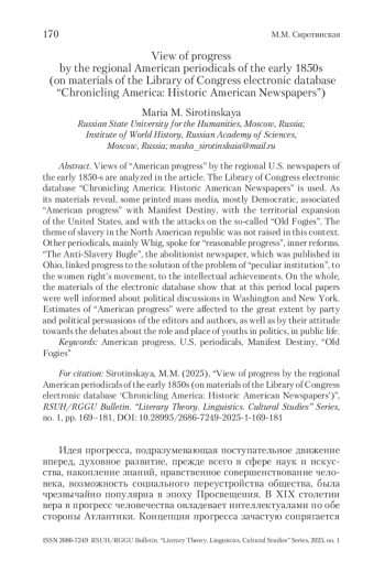 В статье анализируется восприятие «американского прогресса» в региональных газетах США начала 1850-х гг. Использована электронная база данных исторической американской периодики Библиотеки Конгресса. Как показывают ее материалы, некоторые периодические издания, главным образом демократические, связывали «американский прогресс» с доктриной «предопределения судьбы», с территориальной экспансией Соединенных Штатов, с атаками на так называемых «старых ретроградов». Вопрос о рабстве в североамериканской республике в этом контексте не поднимался. Другие газеты, в основном вигские, выступали за «разумный прогресс», за внутренние реформы. Публиковавшаяся в Огайо аболиционистская “The Anti-Slavery Bugle” ассоциировала прогресс с решением проблемы «особого института», с движением за права женщин, с интеллектуальными достижениями. В целом изученные материалы электронной базы свидетельствуют о том, что в данный период местные газеты были хорошо осведомлены о политических дебатах в Вашингтоне и Нью-Йорке. Оценки «американского прогресса» в значительной степени определялись партийно-политическими симпатиями редакторов и публицистов, а также их отношением к вопросу о роли и месте молодежи в политике, в общественной жизни.