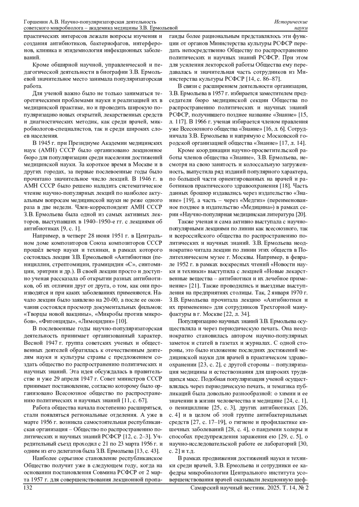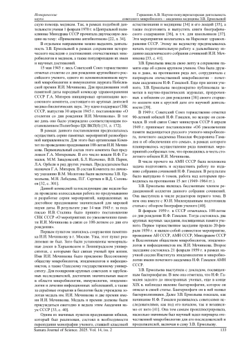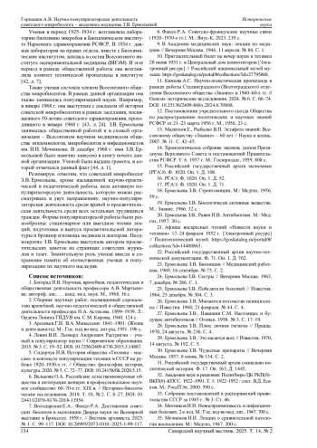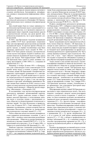 В представленной статье анализируется научно-популяризаторская деятельность известного советского ученого-микробиолога - академика медицины, профессора, заслуженного деятеля науки РСФСР З. В. Ермольевой, одной из основоположниц отечественной антибиотической промышленности. Реконструируются магистральные направления и формы популяризаторской работы ученой: чтение лекций для медиков и обычных граждан, публикация просветительских заметок в изданиях периодической печати, издание научно-популярных брошюр, а также участие в ряде мероприятий, направленных на сохранение и популяризацию известных отечественных ученых прошлого. В качестве источников для статьи использовались неопубликованные документы Российского государственного архива экономики, Государственного архива Российской Федерации, Российского государственного архива социально-политической истории и Российского государственного архива научно-технической документации. Из опубликованных источников использовались научно-популярные брошюры З. В. Ермольевой, а также ее статьи и заметки в периодической печати изучаемого периода.