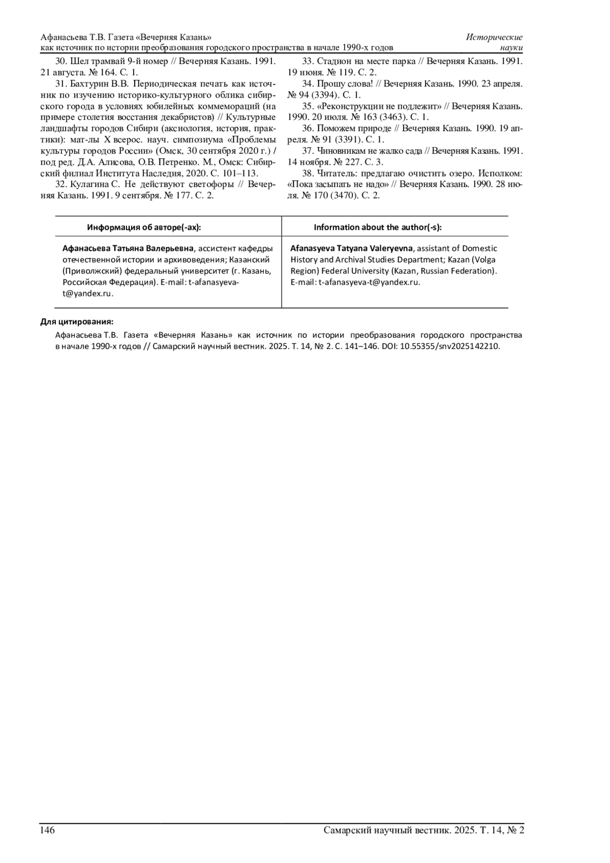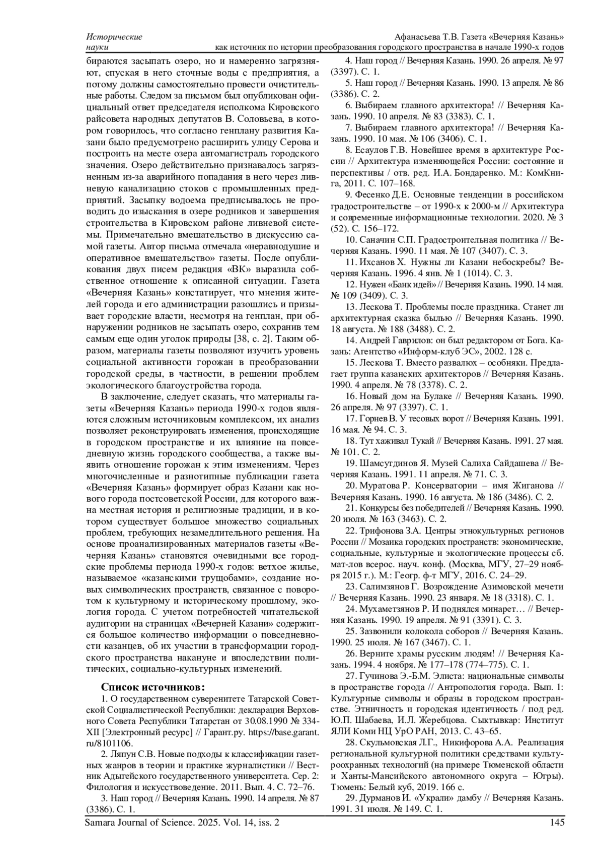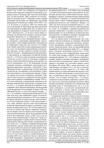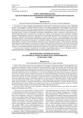 В статье впервые рассматривается общественно-политическая городская газета «Вечерняя Казань» как значимый и содержательный источник по истории трансформации пространства постсоветской Казани в начале 1990-х годов. На основе материалов газеты «Вечерняя Казань» начала 1990-х годов выявлены ключевые направления преобразований городского ландшафта и развития городской среды Казани. Проведенный анализ газетных публикаций показывает формирование нового городского полиэтнического и многоконфессионального пространства постсоветского города. Актуальным остается выявление основных факторов трансформации городского пространства и взаимодействия различных городских систем Казани в контексте социально-политического переворота в России конца XX века. Статья раскрывает роль газеты «Вечерняя Казань» в актуализации преобразовательных процессов посредством интерактивных публикаций среди широкой читательской аудитории, ее активной позиции в области организации читателей для непосредственного участия в благоустройстве городской среды. «Вечерняя Казань» уделяла большое внимание общественным инициативам, что позволяет составить характеристику исторического контекста исследуемой эпохи, быта и досуга, поведенческих практик горожан и социокультурного пространства города изучаемого периода, а также выявить реакцию общественного мнения на создание нового образа постсоветского города.