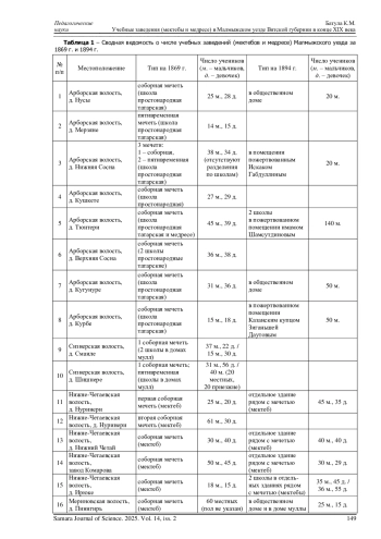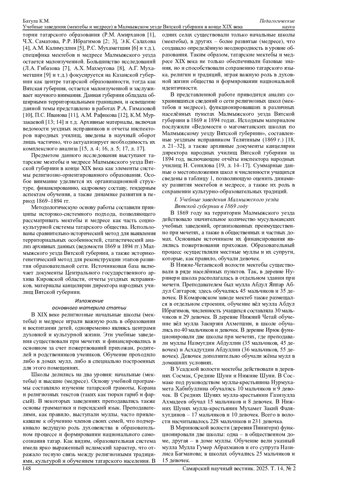 Исследование фокусируется на ключевой роли начальных школ (мектебов) и медресе в Малмыжском уезде Вятской губернии конца XIX века в формировании системы образования, сохранении этнокультурной идентичности и религиозно-нравственных ценностей татарского народа. В условиях полиэтнической Российской империи эти учебные заведения служили не только центрами просвещения, но и инструментами воспроизводства традиционного уклада. Особое внимание уделяется функционированию мектебов и медресе как учебных заведений, существовавших при мечетях и поддерживавшихся за счёт средств татарской общины. Делается вывод о значении мектебов и медресе как институтов, обеспечивавших не только базовое образование, но и способствовавших сохранению культурной и религиозной идентичности мусульманского населения региона. Отмечаются территориальные особенности функционирования школ, их финансирование за счёт общинных средств и активное участие духовенства, включая женщин. На основе сравнительных данных подчёркивается адаптивность сети мектебов и медресе к социальным изменениям и нарастанию модернизационных процессов в Российской империи. Исследование основывается на архивных документах, включая ведомости уездных исправников и отчеты инспекторов народных училищ, и использует историко-системный, сравнительно-исторический и статистический анализ для реконструкции этапов развития образовательной сети.