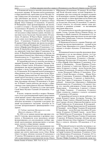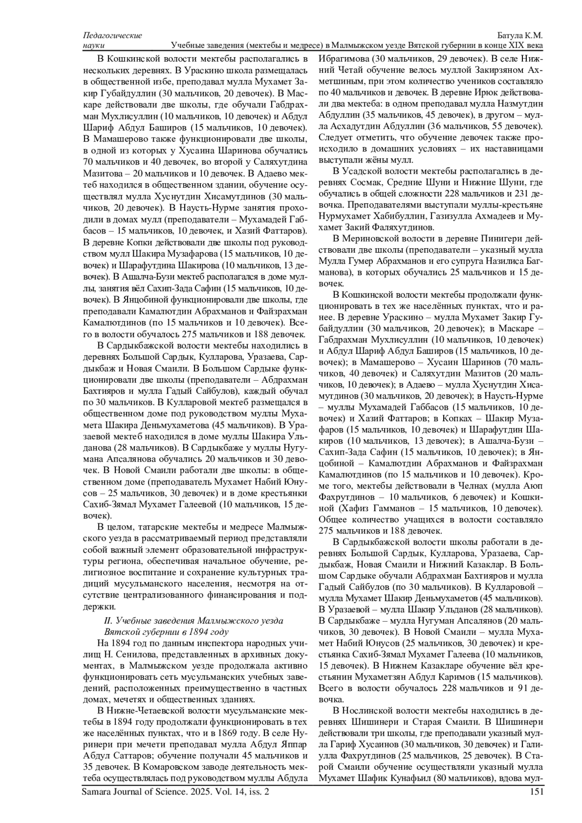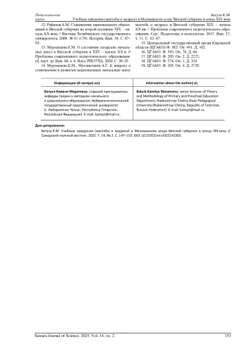 14. Мурзакаева К.М., Мухаметшин А.Г. К вопросу о становлении и развитии национальных начальных школ мектебе и медресе в Вятской губернии XIX - начала XX вв. // Проблемы современного педагогического образования. Сер.: Педагогика и психология. 2017. Вып. 57, ч. 11. С. 42-47.