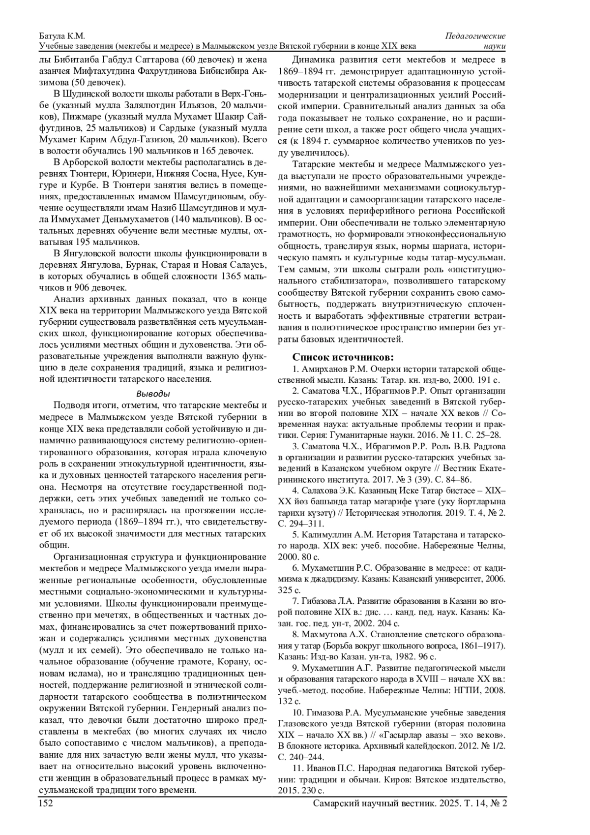 2. Саматова Ч.Х., Ибрагимов Р.Р. Опыт организации русско-татарских учебных заведений в Вятской губернии во второй половине XIX - начале XX веков // Современная наука: актуальные проблемы теории и практики. Серия: Гуманитарные науки. 2016. № 11. С. 25-28. EDN: XHZWYN