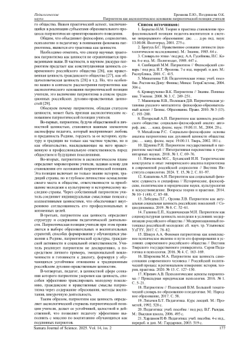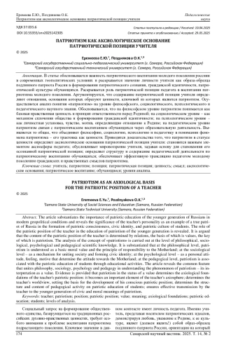 В статье обосновывается важность патриотического воспитания молодого поколения россиян в современных геополитических условиях и раскрывается значение личности учителя как образа-образца подлинного патриота России в формировании патриотического сознания, гражданской идентичности, патриотической культуры обучающихся. Раскрывается роль патриотической позиции педагога в воспитании патриотизма молодого поколения. Аргументируется, что содержание патриотической позиции учителя определяют отношения, основания которых образуют ценности, ключевой из которых является патриотизм. Осуществляется анализ понятия «патриотизм» на уровне философского, социологического, психологического и педагогического научного знания. Обосновывается, что на философском уровне патриотизм понимается как базовая нравственная ценность и принцип ответственности перед Родиной; на социологическом уровне - как механизм сплочения общества и формирования гражданской идентичности; на психологическом уровне - как личностная установка, чувство, мотив, определяющие отношение к Родине; на педагогическом уровне патриотизм связан с патриотическим воспитанием обучающихся через образовательную деятельность. Выявляется то общее, что объединяет философию, социологию, психологию и педагогику в понимании феномена патриотизма - его трактовка как ценности. Приводятся доказательства того, что патриотизм в статусе ценности определяет аксиологические основания патриотической позиции учителя: становится важным элементом аксиосферы педагога; обусловливает мировоззрение учителя, задавая основу для становления его осознанной патриотической позиции; определяет структуру и содержание педагогической деятельности по патриотическому воспитанию обучающихся; обеспечивает эффективную трансляцию педагогом молодому поколению гражданских и нравственных смыслов патриотизма.