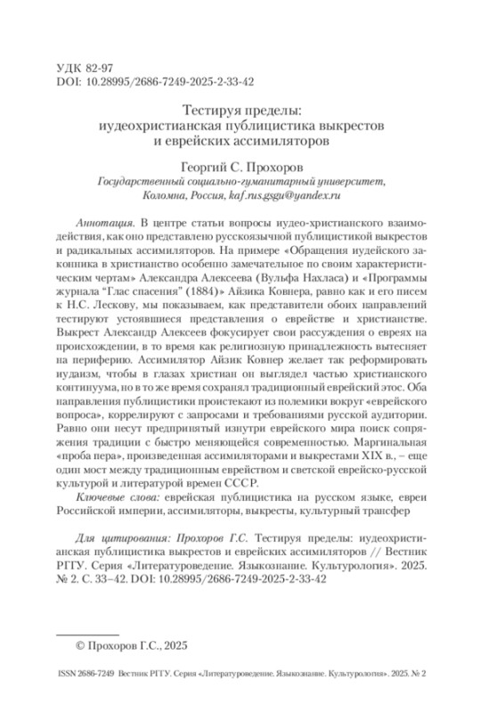 7. Прохоров 2021 - Прохоров Г.С. Еврейство после еврейства: Рудименты еврейской идентичности в мемуарах русских выкрестов конца XIX в. в свете современного опыта // Ежегодник еврейского евро-азиатского конгресса «Евреи Европы и Азии: состояние, перспективы, наследие». Т. 3: Сборник научных и публицистических статей / под ред. З. Ханина, В. Чернина, М. Гольда. Герцлия: Еврейский ун-т Иерусалима, 2021. С. 399-412.