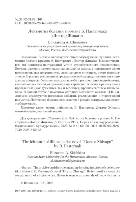 В статье исследуется смыслообразующая функция лейтмотива болезни в романе Б. Пастернака «Доктор Живаго». Под лейтмотивом мы понимаем центральный мотив художественного произведения. Болезнь рассматривается нами как аномалия жизни, в инварианте своем представляющая пограничную, лиминальную ситуацию, нечто ненормативное. В романе революция и гражданская война представлены как социальные процессы, болезненные сами по себе и распространяющие болезнь, «заражающие» людей, окружающее пространство. Болезнь в разных своих проявлениях (как душевных, так и телесных) пронизывает всю ткань романа. В данной статье с помощью методики мотивного анализа И. В. Силантьева исследуются несколько событий, реализующих интересующий нас мотив. Лейтмотив болезни оказывается в романе центральным, сюжетообразующим.