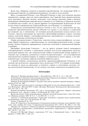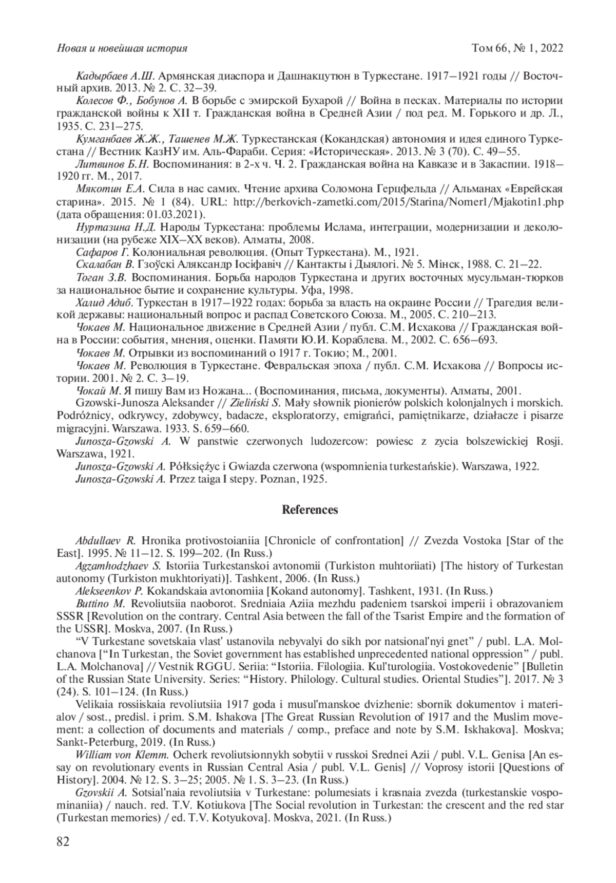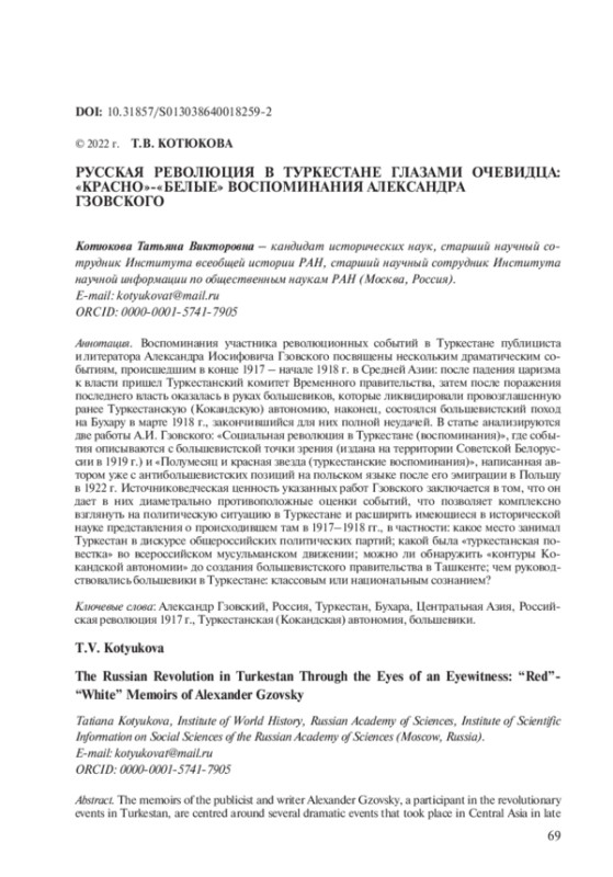 Воспоминания участника революционных событий в Туркестане публициста и литератора Александра Иосифовича Гзовского посвящены нескольким драматическим событиям, происшедшим в конце 1917 – начале 1918 г. в Средней Азии: после падения царизма к власти пришел Туркестанский комитет Временного правительства, затем после поражения последнего власть оказалась в руках большевиков, которые ликвидировали провозглашенную ранее Туркестанскую (Кокандскую) автономию, наконец, состоялся большевистский поход на Бухару в марте 1918 г., закончившийся для них полной неудачей. В статье анализируются две работы А. И. Гзовского: «Социальная революция в Туркестане (воспоминания)», где события описываются с большевистской точки зрения (издана на территории Советской Белоруссии в 1919 г.) и «Полумесяц и красная звезда (туркестанские воспоминания)», написанная автором уже с антибольшевистских позиций на польском языке после его эмиграции в Польшу в 1922 г. Источниковедческая ценность указанных работ Гзовского заключается в том, что он дает в них диаметрально противоположные оценки событий, что позволяет комплексно взглянуть на политическую ситуацию в Туркестане и расширить имеющиеся в исторической науке представления о происходившем там в 1917–1918 гг., в частности: какое место занимал Туркестан в дискурсе общероссийских политических партий; какой была «туркестанская повестка» во всероссийском мусульманском движении; можно ли обнаружить «контуры Кокандской автономии» до создания большевистского правительства в Ташкенте; чем руководствовались большевики в Туркестане: классовым или национальным сознанием?