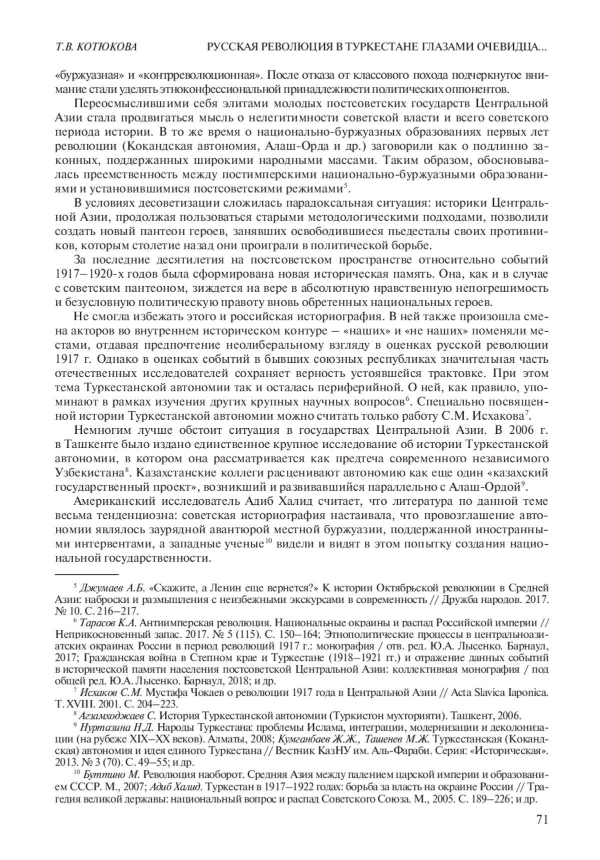 11. 	Джумаев А.Б. “Скажите, а Ленин еще вернется?” К истории Октябрьской революции в Средней Азии: наброски и размышления с неизбежными экскурсами в современность // Дружба народов. 2017. № 10. С. 213-224.