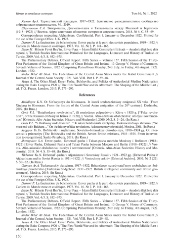 5. 	Тихонов Ю.Н. Джемаль-паша в Афганистане и Советской России в 1921-1922 гг. // Восточный архив. 2010. № 2 (22). C. 50-62. EDN: PAYCDP