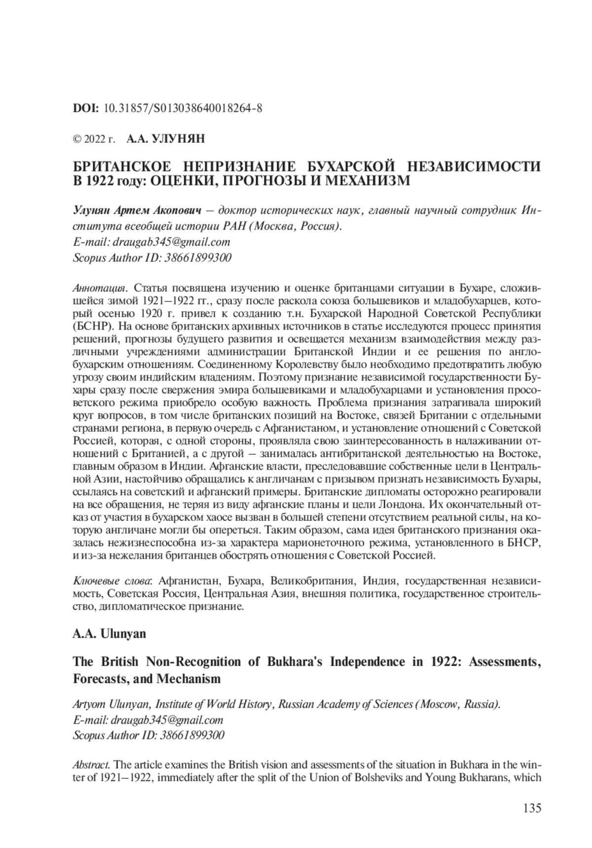 Статья посвящена изучению и оценке британцами ситуации в Бухаре, сложившейся зимой 1921–1922 гг., сразу после раскола союза большевиков и младобухарцев, который осенью 1920 г. привел к созданию т. н. Бухарской Народной Советской Республики (БСНР). На основе британских архивных источников в статье исследуются процесс принятия решений, прогнозы будущего развития и освещается механизм взаимодействия между различными учреждениями администрации Британской Индии и ее решения по англобухарским отношениям. Соединенному Королевству было необходимо предотвратить любую угрозу своим индийским владениям. Поэтому признание независимой государственности Бухары сразу после свержения эмира большевиками и младобухарцами и установления просоветского режима приобрело особую важность. Проблема признания затрагивала широкий круг вопросов, в том числе британских позиций на Востоке, связей Британии с отдельными странами региона, в первую очередь с Афганистаном, и установление отношений с Советской Россией, которая, с одной стороны, проявляла свою заинтересованность в налаживании отношений с Британией, а с другой – занималась антибританской деятельностью на Востоке, главным образом в Индии. Афганские власти, преследовавшие собственные цели в Центральной Азии, настойчиво обращались к англичанам с призывом признать независимость Бухары, ссылаясь на советский и афганский примеры. Британские дипломаты осторожно реагировали на все обращения, не теряя из виду афганские планы и цели Лондона. Их окончательный отказ от участия в бухарском хаосе вызван в большей степени отсутствием реальной силы, на которую англичане могли бы опереться. Таким образом, сама идея британского признания оказалась нежизнеспособна из-за характера марионеточного режима, установленного в БНСР, и из-за нежелания британцев обострять отношения с Советской Россией