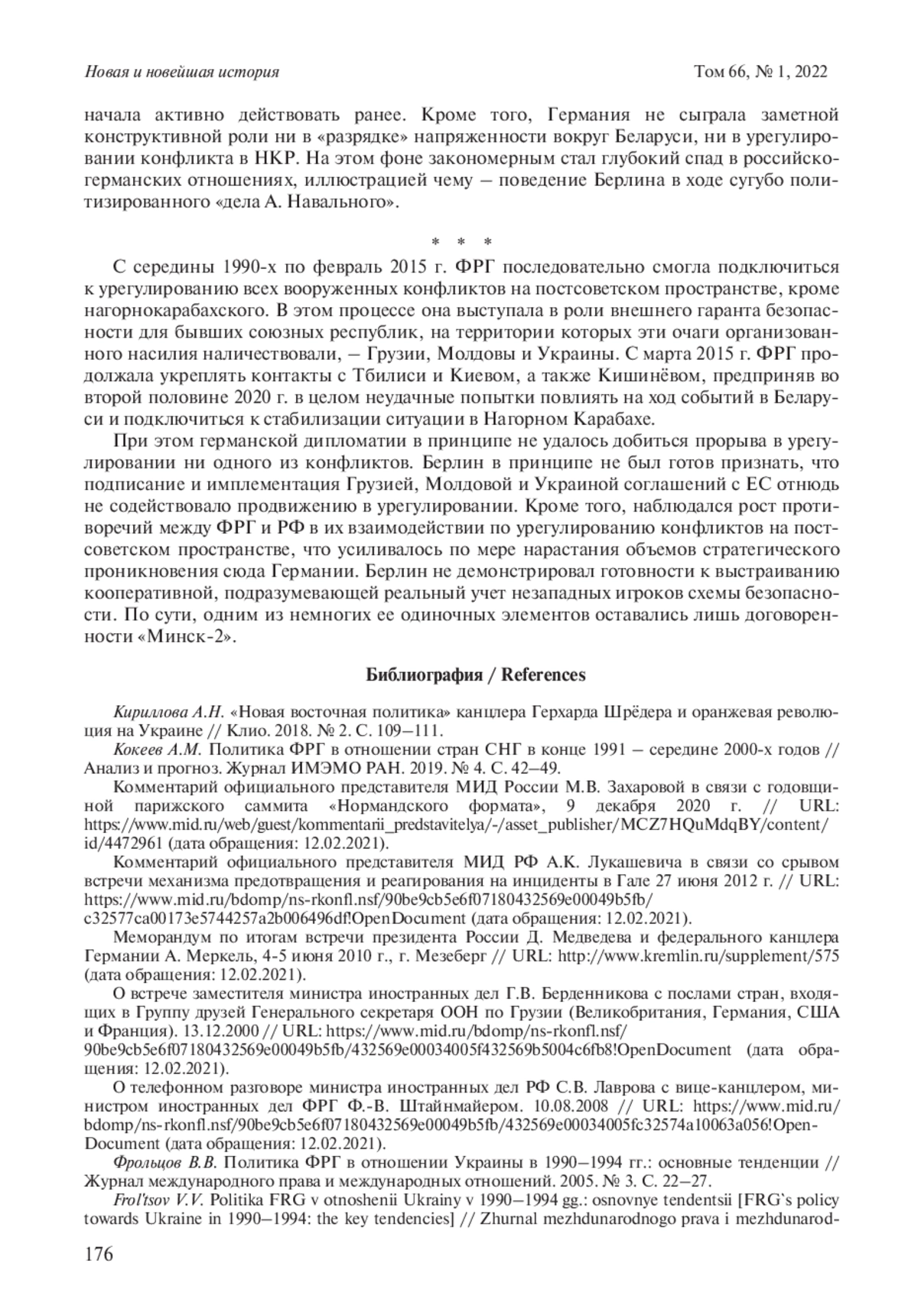 11. 	Kokeev A.M. Politika FRG v otnoshenii stran SNG v kontse 1991 - seredine 2000-kh godov [FRG’s policy towards the states of Post-Soviet space since the end of 1991 until middle 2020-s] // Analiz i prognoz. Zhurnal IMEMO RANn [Analysis and forecast. IMEMO RAS Journal]. 2019. № 4. S. 42-49. (In Russ.).