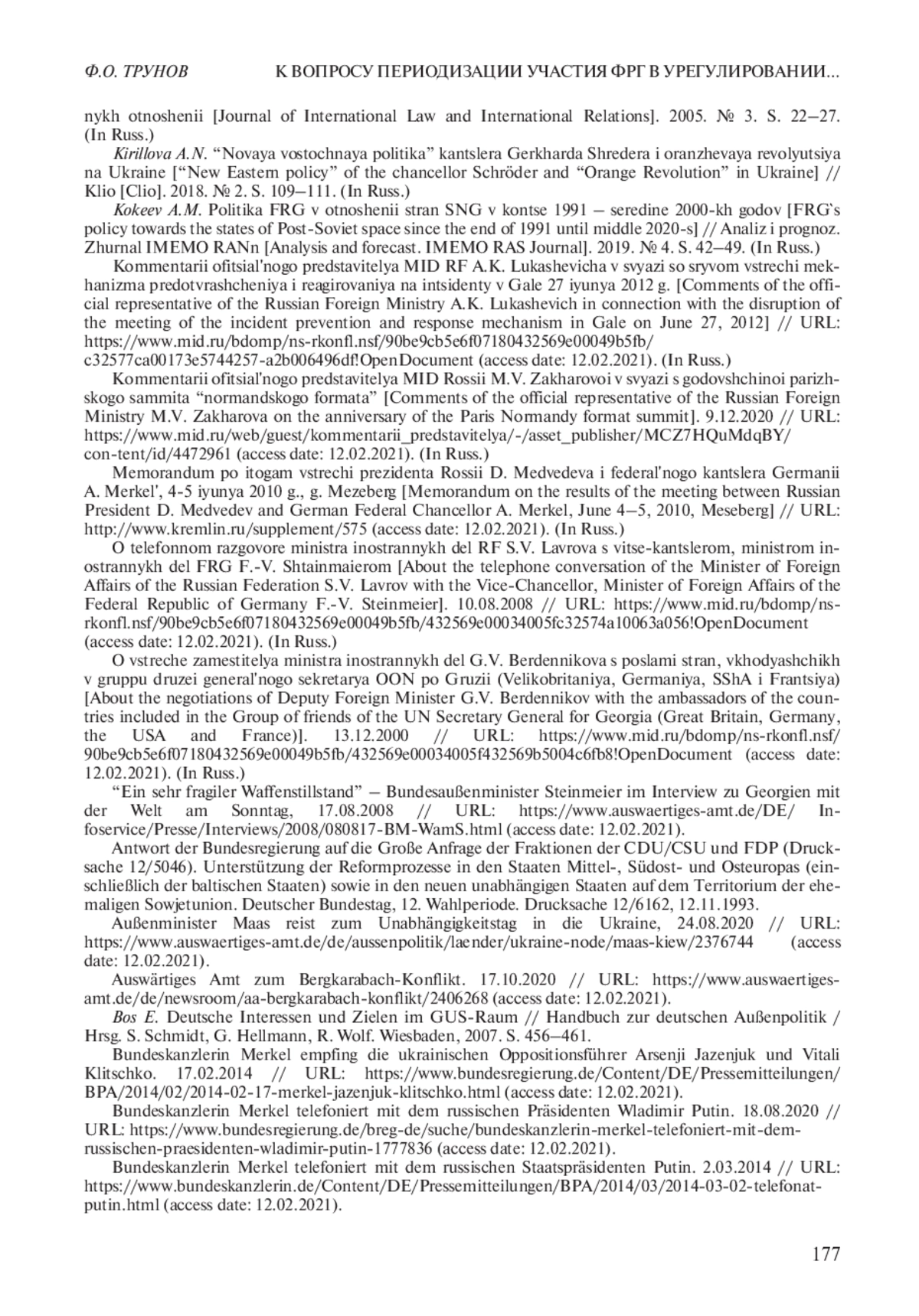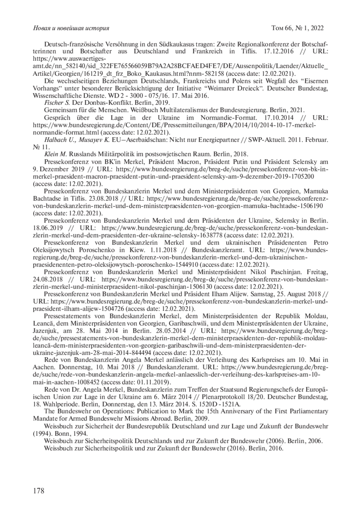 14. 	Memorandum po itogam vstrechi prezidenta Rossii D. Medvedeva i federal’nogo kantslera Germanii A. Merkel’, 4-5 iyunya 2010 g., g. Mezeberg [Memorandum on the results of the meeting between Russian President D. Medvedev and German Federal Chancellor A. Merkel, June 4-5, 2010, Meseberg] // URL: http://www.kremlin.ru/supplement/575 (access date: 12.02.2021). (In Russ.).