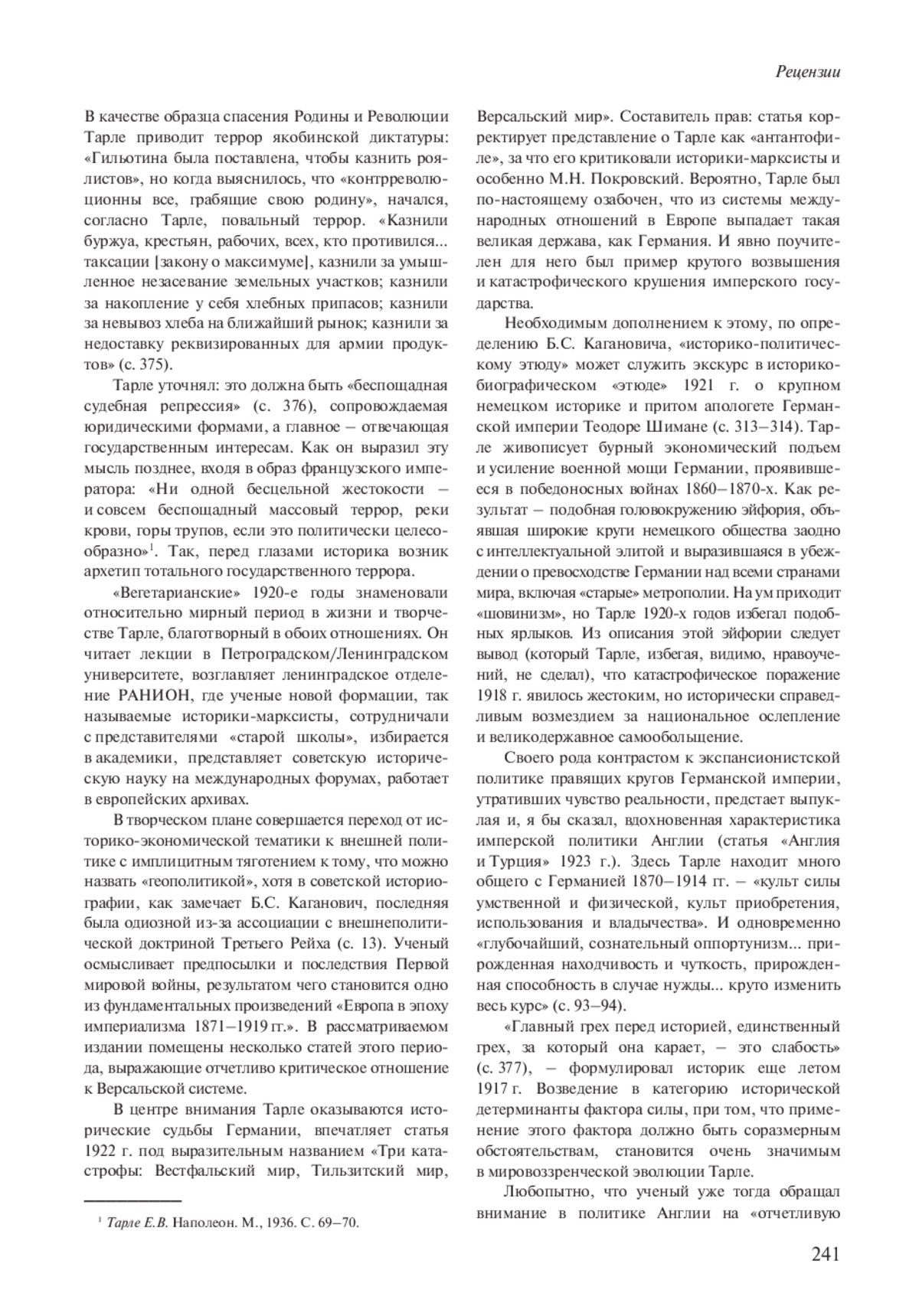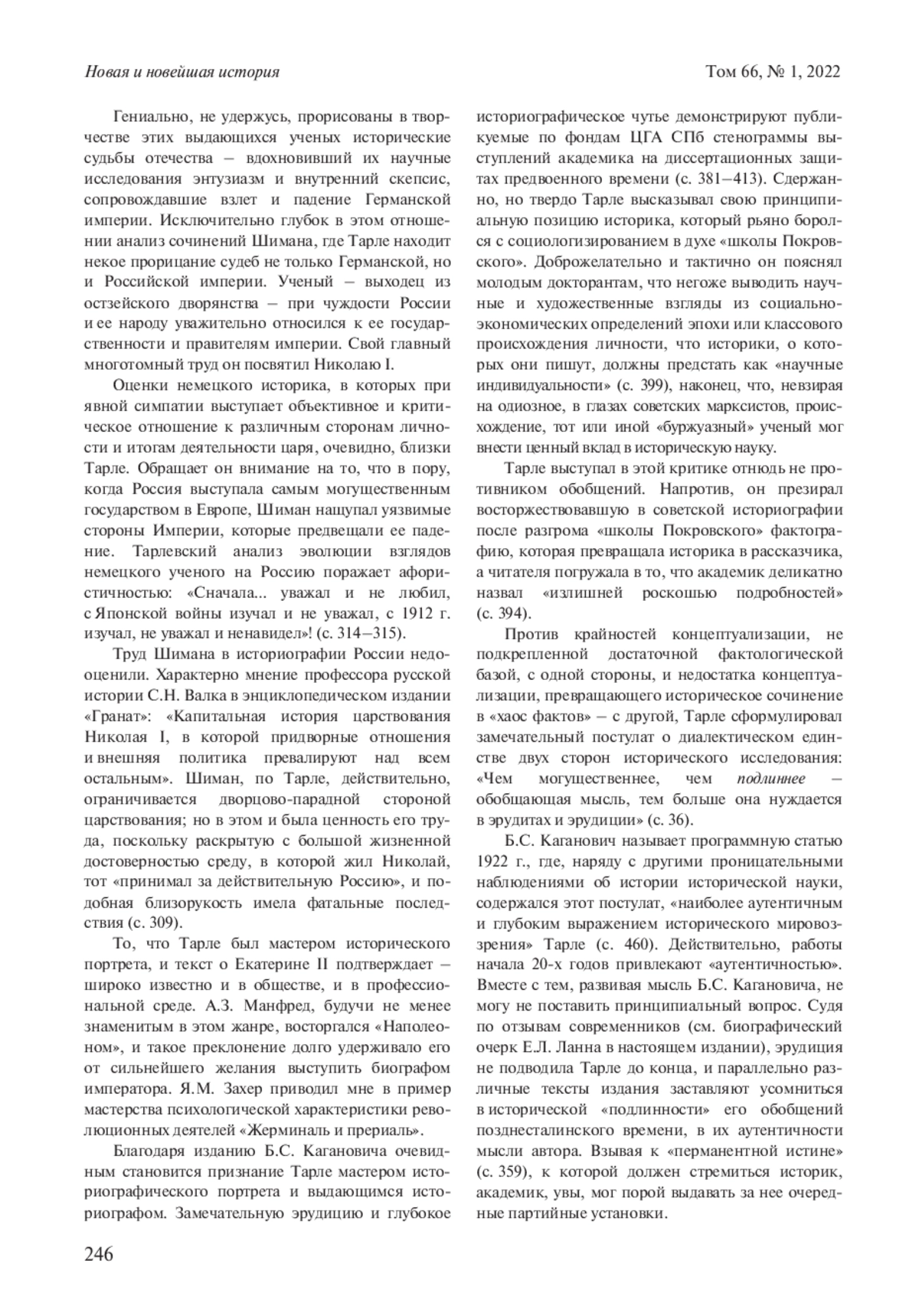 Рецензируемое издание – последний труд скончавшегося в январе 2021 г. петербургского историка, лауреата премии имени Тарле Бориса Соломоновича Кагановича. Замечательный исследователь прославленной Петербургской исторической школы Б. С. Каганович почти все свое творчество посвятил ее выдающемуся представителю. Результат многолетнего историографического труда и систематических архивных и библиографических изысканий – издание уникально публикацией «неканонического» Тарле, не вошедших в собрание сочинений малоизвестных и частично не публиковавшихся работ. Благодаря исключительно вдумчивому отбору составителя читатель получает яркое и целостное впечатление о многообразии творчества Тарле и динамике его научных и общественно-политических взглядов