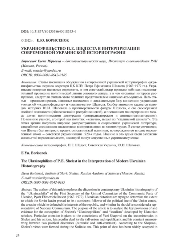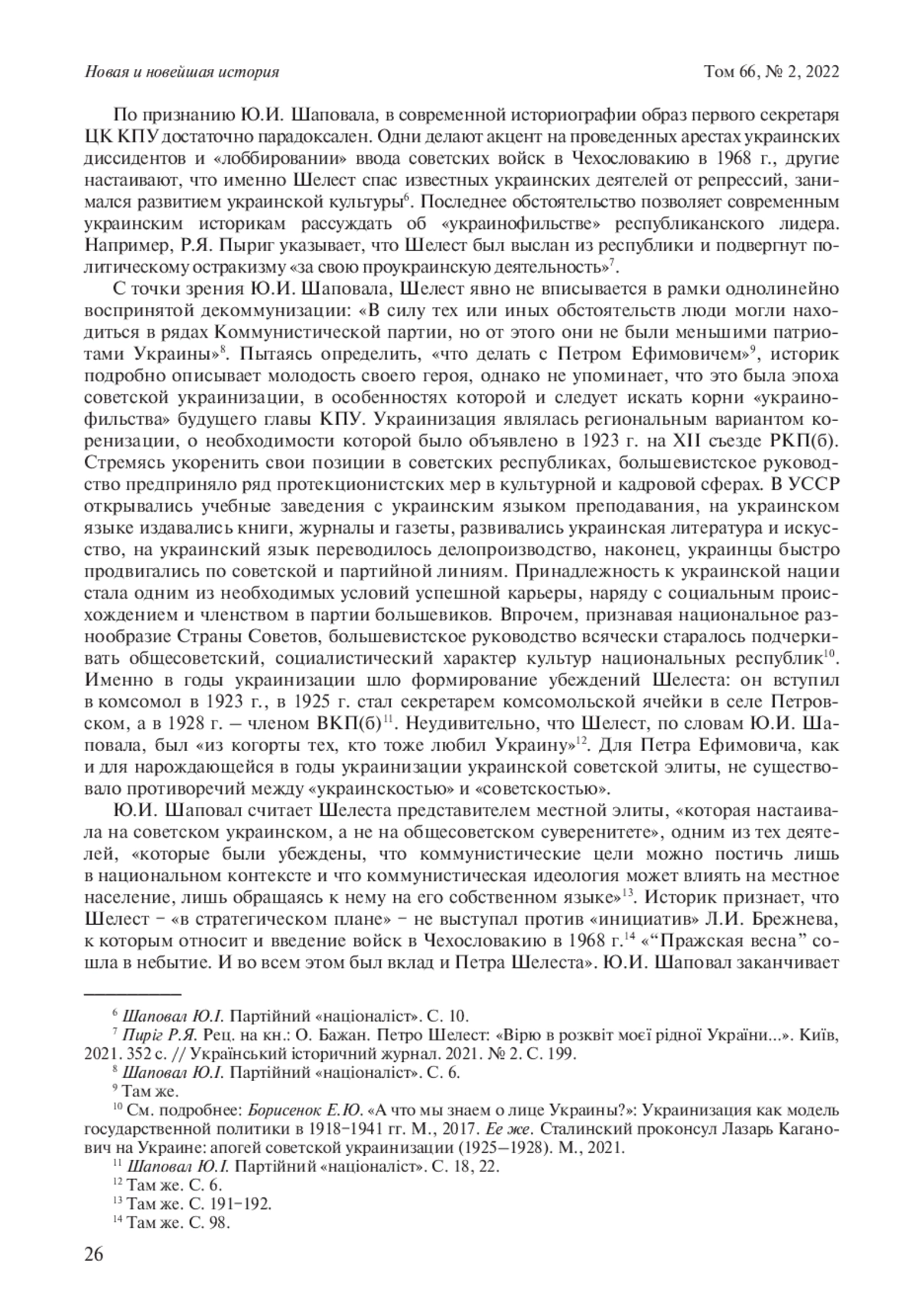 Статья посвящена обсуждению в современной украинской историографии «украинофильства» первого секретаря ЦК КПУ Петра Ефимовича Шелеста (1963‒1972 гг.). Украинские историки пытаются определить, в чем советский лидер проявлял себя как последовательный проводник политической линии союзного центра, а в чем отстаивал интересы республики, следует ли считать этого политика представителем национал-коммунизма. Цель статьи – проанализировать основные положения и доказательную базу концепции украинских ученых об «украинофильстве» и «местничестве» Шелеста. Особое внимание уделяется выводам историка Ю. И. Шаповала о противоречивости фигуры Шелеста, о его своеобразной двойной лояльности (общесоюзной и республиканской), о постоянном маневрировании между двумя политическими дискурсами (централизаторским и антицентрализаторским). По мнению ученого, его герой как политик, «конечно, вышел из “сталинской шинели”». Эта точка зрения получила широкое распространение в современной украинской литературе, а наработки специалиста-шелестоведа воспроизводятся во многих трудах. В статье уточняется, что Шелест был не просто продуктом сталинской политики, но порождением вполне определенной эпохи – советской украинизации 1920-х годов. Именно в это время были заложены основы той парадоксальности, о которой пишут современные украинские ученые.