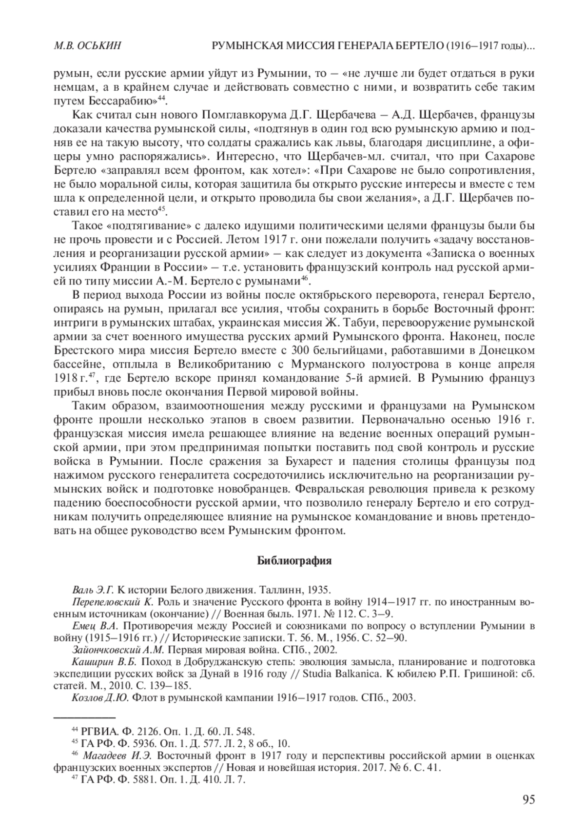 Вступление Румынского королевства в Первую мировую войну в 1916 г. предполагало оказание ей помощи со стороны союзников по Антанте. Русские войска воевали совместно с румынами на Восточном фронте, западные союзники помогали оружием, финансами и опытными офицерами. Военное сотрудничество на различных европейских театрах войны являлось достаточно сложной задачей, а его организация актуализирует проблемы взаимодействия союзников по оружию для достижения общей цели. Французская миссия генерала Бертело оказала румынской армии самую разнообразную поддержку – руководство боевыми действиями осенью 1916 г., реорганизация разгромленной румынской армии, выполнение роли военных советников в кампании 1917 г. В этом отношении французы соперничали с русскими за влияние на высшее румынское руководство – прежде всего военное командование. Создание Румынского фронта, состоявшего в основном из русских войск, позволило русской Ставке отстранить французов от непосредственного влияния на ход военных действий. Деятельность французской миссии ограничивалась приведением в порядок отведенных в тыл румынских подразделений. Однако в 1917 г. французы вновь заняли лидирующее положение в воздействии на румынский генералитет. Переломным моментом в этом сотрудничестве-соперничестве стала Февральская революция, окончательно закрепившая ведущую роль миссии Бертело в делах румынской армии на Румынском фронте. Деятельность французской миссии помогла реорганизовать румынскую армию, сыгравшую решающую роль на заключительном этапе Первой мировой войны, позволив Румынскому королевству остаться в числе победителей, невзирая на перипетии 1918 г., связанные с выходом России из войны. Основными источниками статьи послужили документы Российского государственного военно-исторического архива (РГВИА), относящиеся прежде всего к компетенции центральных органов военной власти и управления в военный период – Ставки Верховного командования и Главного управления Генерального штаба