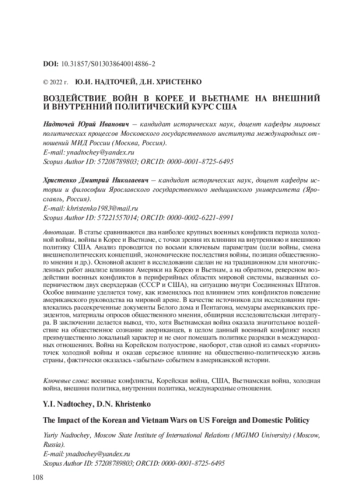 В статье сравниваются два наиболее крупных военных конфликта периода холодной войны, войны в Корее и Вьетнаме, с точки зрения их влияния на внутреннюю и внешнюю политику США. Анализ проводится по восьми ключевым параметрам (цели войны, смена внешнеполитических концепций, экономические последствия войны, позиция общественного мнения и др.). Основной акцент в исследовании сделан не на традиционном для многочисленных работ анализе влияния Америки на Корею и Вьетнам, а на обратном, реверсном воздействии военных конфликтов в периферийных областях мировой системы, вызванных соперничеством двух сверхдержав (СССР и США), на ситуацию внутри Соединенных Штатов. Особое внимание уделяется тому, как изменялось под влиянием этих конфликтов поведение американского руководства на мировой арене. В качестве источников для исследования привлекались рассекреченные документы Белого дома и Пентагона, мемуары американских президентов, материалы опросов общественного мнения, обширная исследовательская литература. В заключении делается вывод, что, хотя Вьетнамская война оказала значительное воздействие на общественное сознание американцев, в целом данный военный конфликт носил преимущественно локальный характер и не смог помешать политике разрядки в международных отношениях. Война на Корейском полуострове, наоборот, став одной из самых «горячих» точек холодной войны и оказав серьезное влияние на общественно-политическую жизнь страны, фактически оказалась «забытым» событием в американской истории