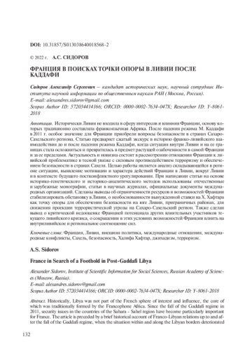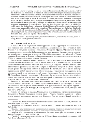 Исторически Ливия не входила в сферу интересов и влияния Франции, основу которых традиционно составляла франкоязычная Африка. После падения режима М. Каддафи в 2011 г. особое значение для Франции приобрели вопросы безопасности в странах СахароСахельского региона. Статью предваряет сжатый экскурс в историю франко-ливийского взаимодействия до и после падения режима Каддафи, когда ситуация внутри Ливии и на ее границах стала осложняться и превратилась в предмет растущей озабоченности в самой Франции и за ее пределами. Актуальность и новизна состоят в рассмотрении отношения Франции к ливийской проблематике в тесной увязке с силовым противодействием терроризму и обеспечением безопасности в странах Сахеля. Целью работы является анализ складывающейся в регионе ситуации, выявление мотивации и характера действий Франции в Ливии, вокруг Ливии и в контексте будущего постконфликтного урегулирования. При написании статьи на основе историко-генетического и историко-аналитического методов использованы отечественные и зарубежные монографии, статьи в научных журналах, официальные документы международных организаций. Сделаны выводы об ограниченности ресурсов и возможностей Франции стабилизировать обстановку в Ливии, о необоснованности вынужденной ставки на Х. Хафтара как точку опоры для обеспечения безопасности на юге Ливии, приграничных районах, для снижения проекции террористической угрозы на Сахаро-Сахельский регион. Также сделан вывод о критической недооценке Францией потенциала других влиятельных участников текущего ливийского кризиса, о сокращении в этих условиях возможностей Франции влиять на внутриливийское и региональное соотношение сил