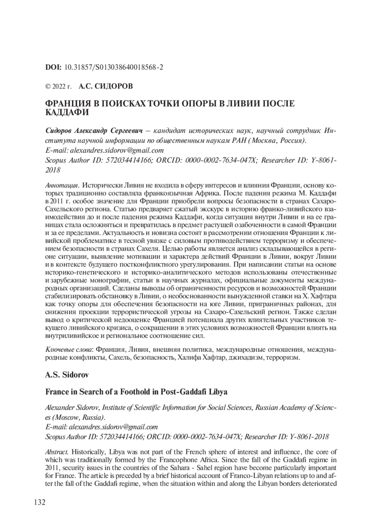 21. 	Sidorov A.S. Afrikanskaya arkhitektura mira i bezopasnosti i konflikt v Sakhele [African architecture of peace and security and the conflict in the Sahel] // Rossiya i sovremennyy mir [Russia and the Modern World]. 2020. № 3. S. 175-190. (In Russ.). EDN: GCQXGF