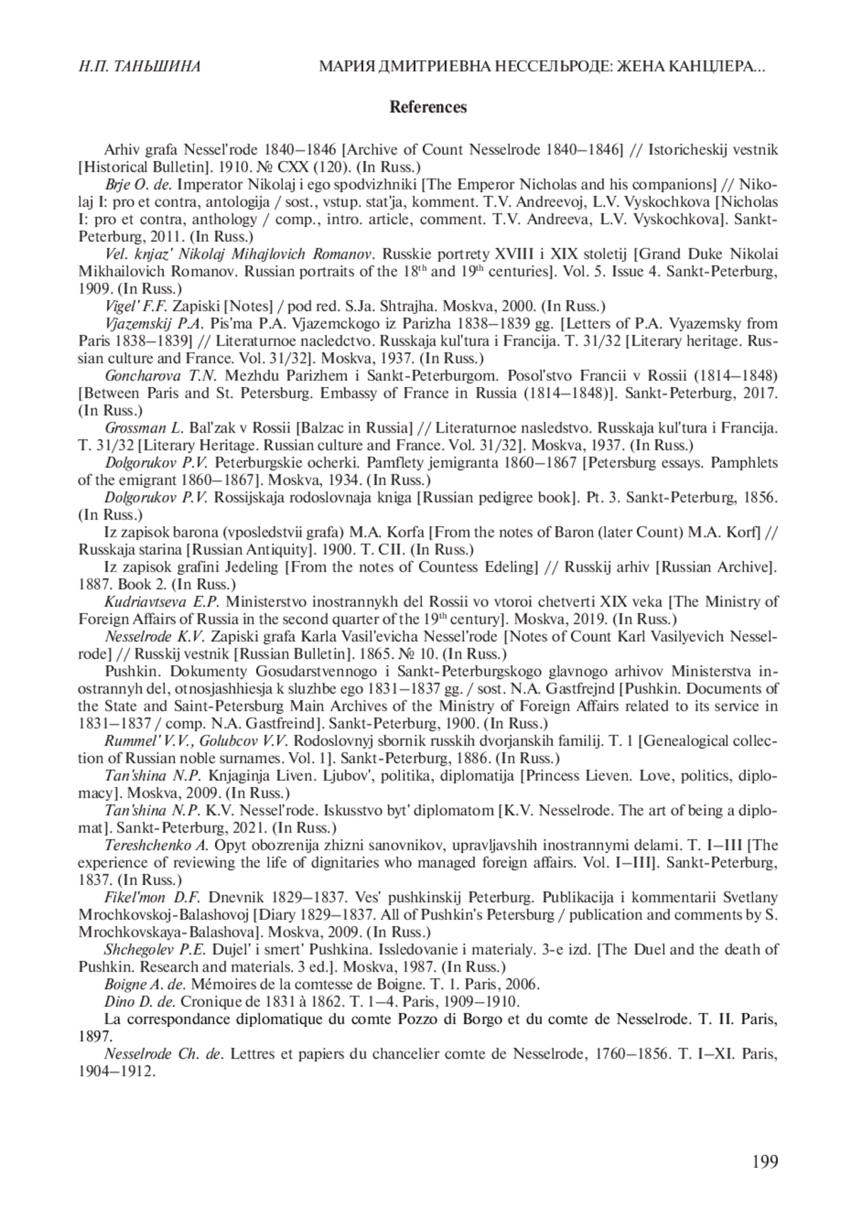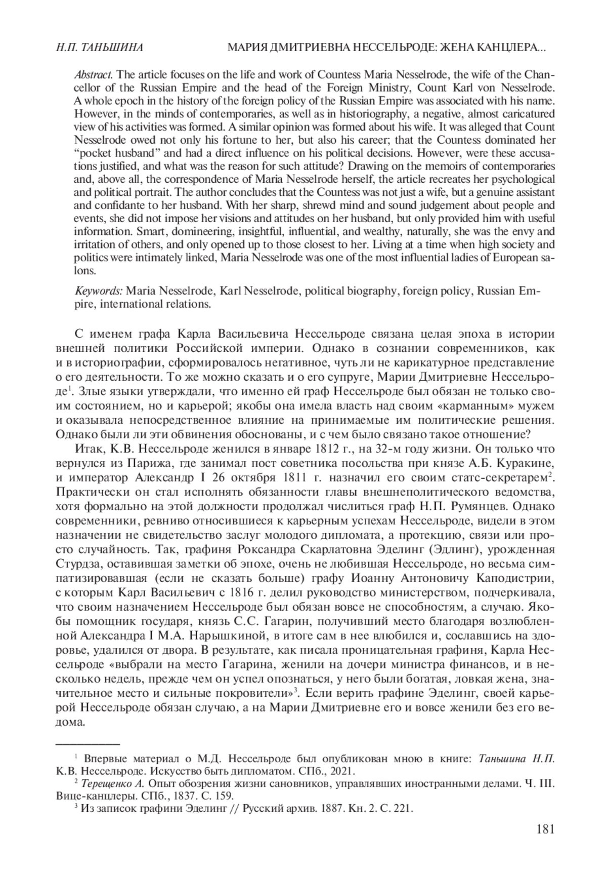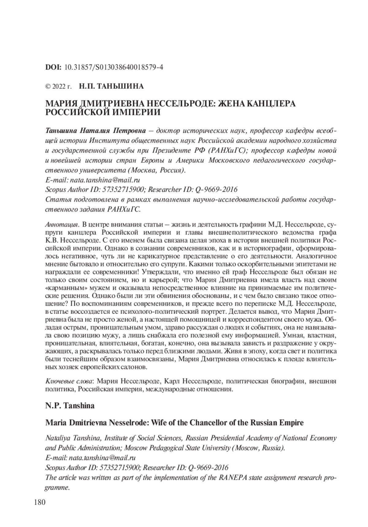 ТАНЬШИНА Н. П. МАРИЯ ДМИТРИЕВНА НЕССЕЛЬРОДЕ: ЖЕНА КАНЦЛЕРА РОССИЙСКОЙ ИМПЕРИИ // НОВАЯ И НОВЕЙШАЯ ИСТОРИЯ. 2022. № 2