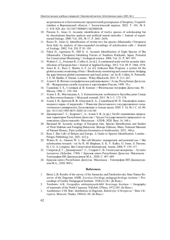 11. Russo D., Jones G. Identification of twenty-two bat species (Mammalia: Chiroptera) from Italy by analysis of time-expanded recordings of echolocation calls // Journal of Zoology. 2002. Vol. 258. P. 91-103.