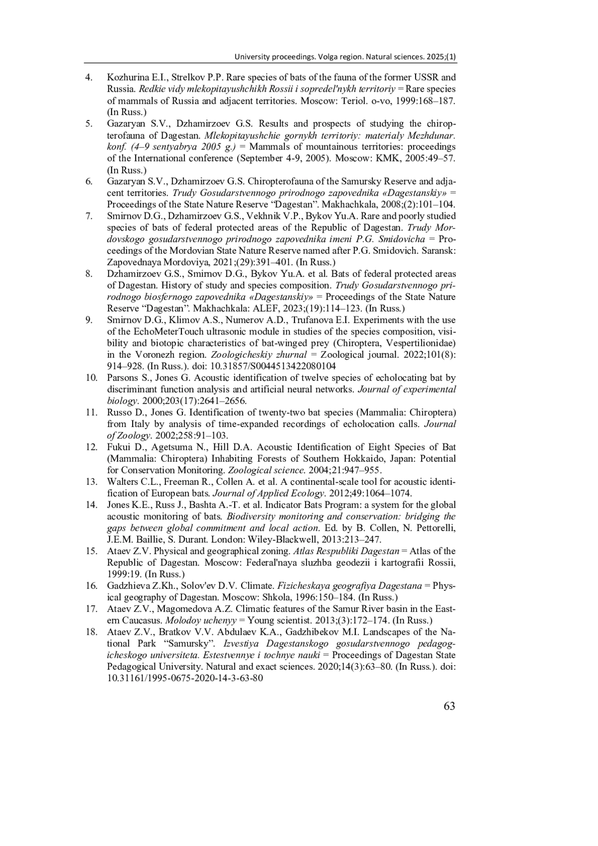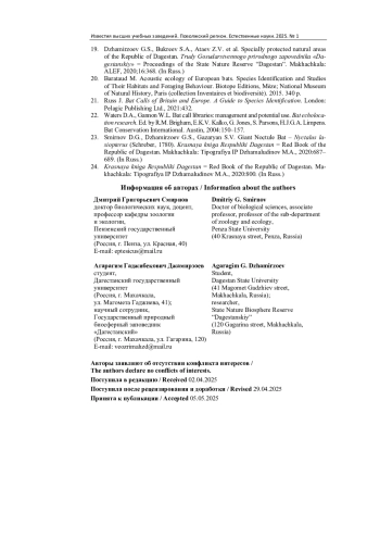 8. Джамирзоев Г. С., Смирнов Д. Г., Быков Ю. А. [и др.]. Рукокрылые федеральных ООПТ Дагестана. История изучения и видовой состав // Труды Государственного природного биосферного заповедника “Дагестанский”. Махачкала: АЛЕФ, 2023. Вып. 19. С. 114-123.