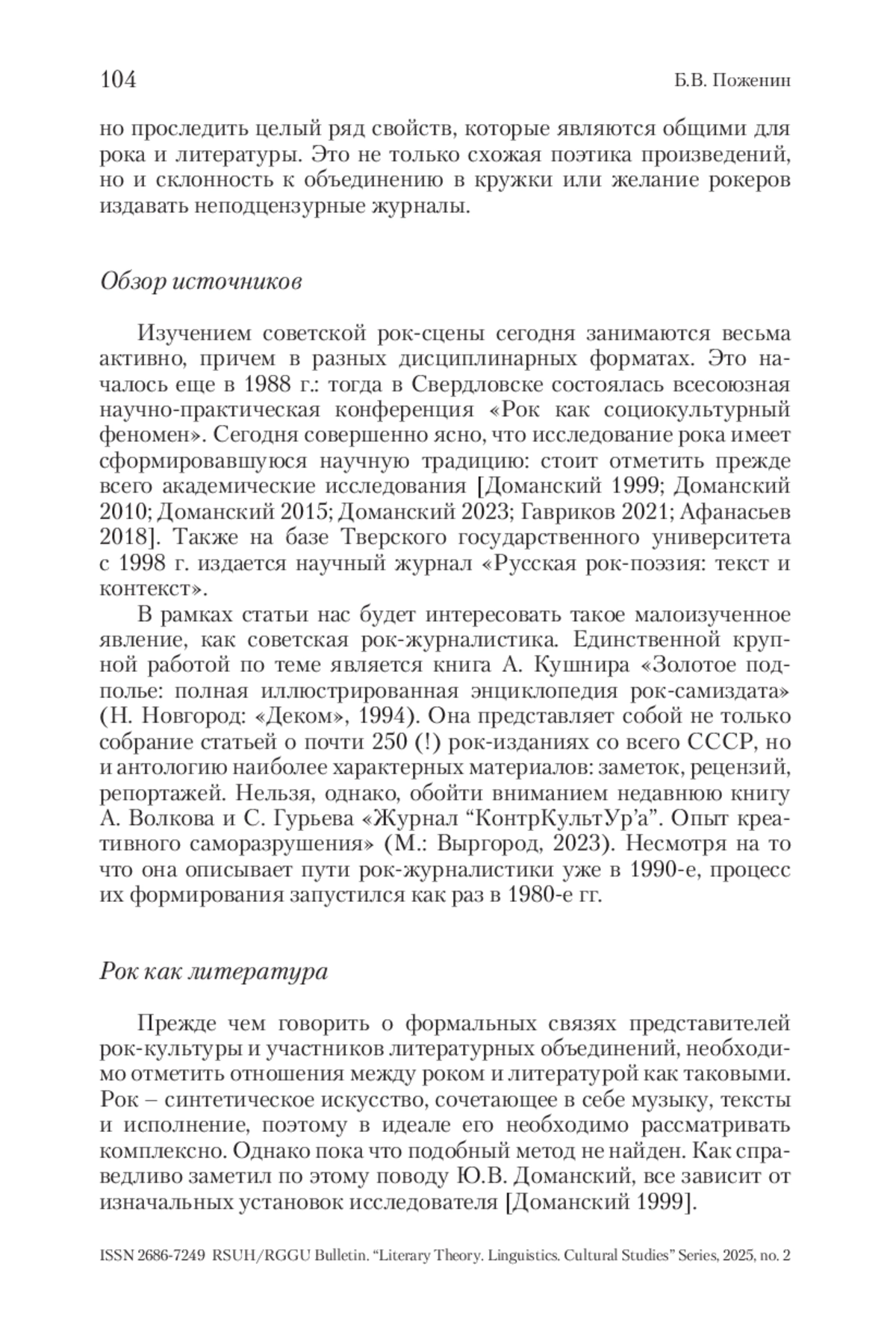 ПОЖЕНИН Б. В. РОК-КУЛЬТУРА И ЛИТЕРАТУРА СССР В 1970–1980-Х ГГ.: ТОЧКИ СОПРИКОСНОВЕНИЯ // ВЕСТНИК РГГУ. СЕРИЯ «ЛИТЕРАТУРОВЕДЕНИЕ. ЯЗЫКОЗНАНИЕ. КУЛЬТУРОЛОГИЯ». 2025. № 2