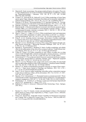 14. 	Umdale S. D., Aitawade M. M., Gaikwad N. [et al.]. Pollen morphology of Asian Vigna species (genus Vigna; subgenus Ceratotropis) from India and its taxonomic implications // Turkish Journal of Botany. 2017. Vol. 41, № 1. P. 75-87. DOI: 10.3906/bot-1603-31