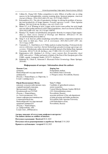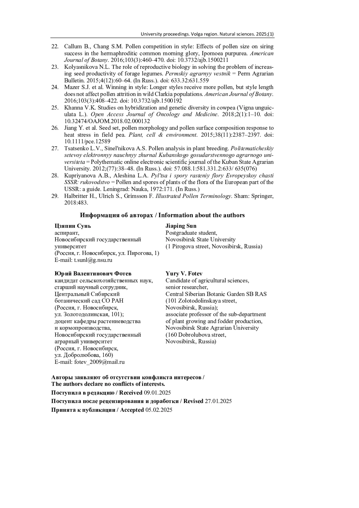 26. 	Jiang Y. [et al.]. Seed set, pollen morphology and pollen surface composition response to heat stress in field pea // Plant, cell & environment. 2015. Vol. 38, № 11. P. 2387-2397. DOI: 10.1111/pce.12589
