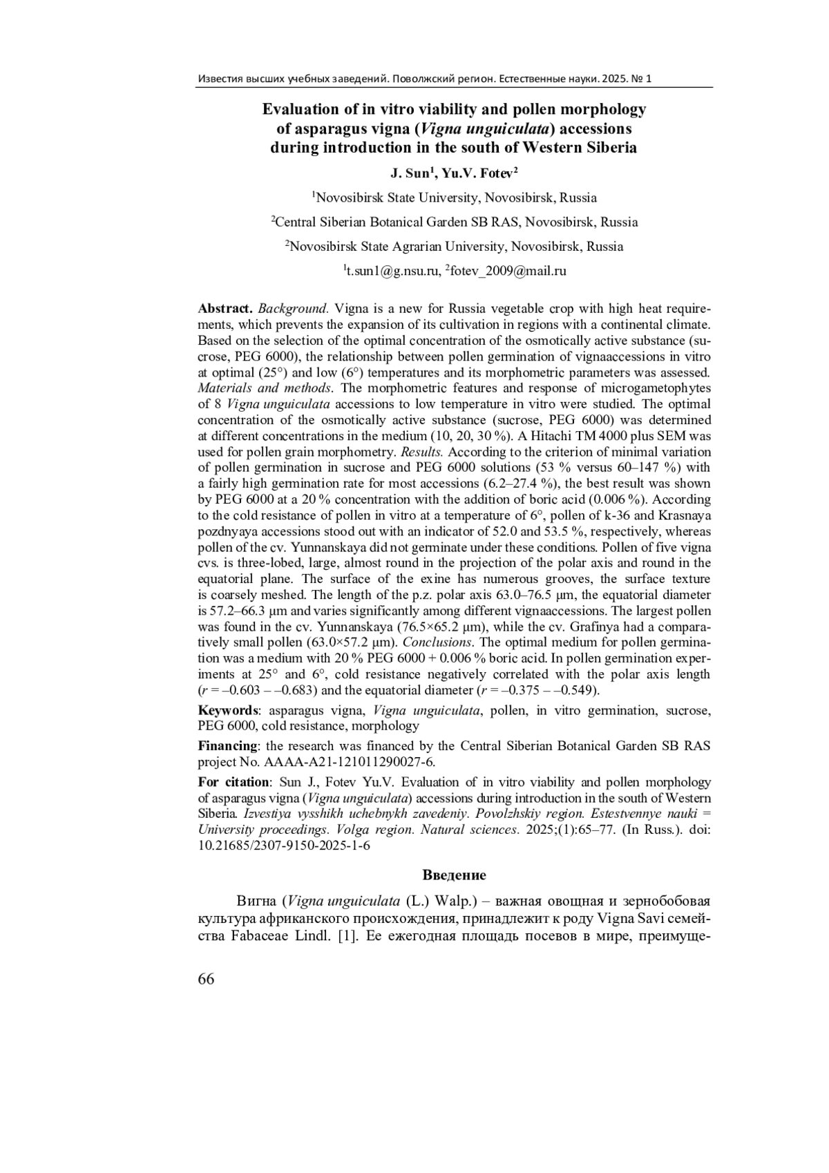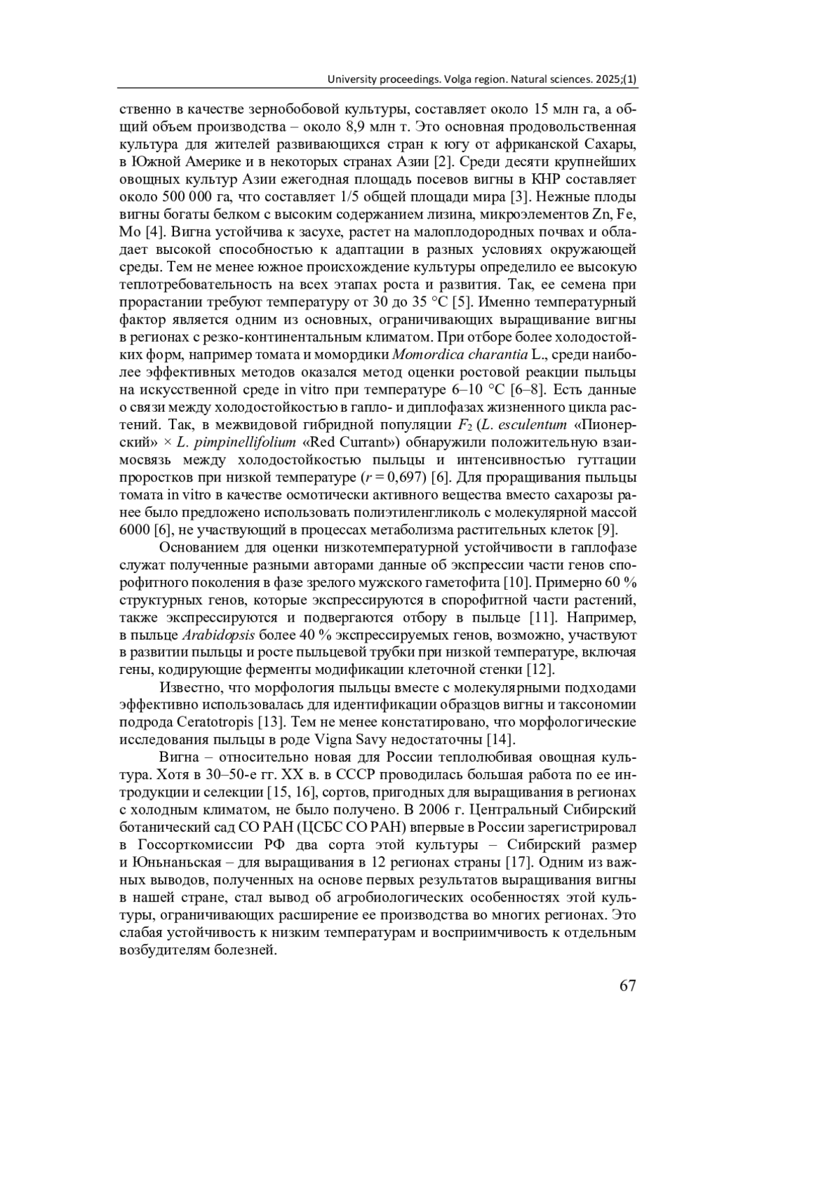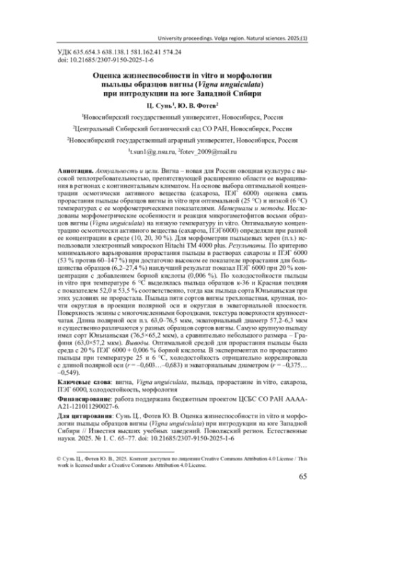 Актуальность и цели. Вигна – новая для России овощная культура с высокой теплотребовательностью, препятствующей расширению области ее выращивания в регионах с континентальным климатом. На основе выбора оптимальной концентрации осмотически активного вещества (сахароза, ПЭГ 6000) оценена связь прорастания пыльцы образцов вигны in vitro при оптимальной (25 °C) и низкой (6 °C) температурах с ее морфометрическими показателями. Материалы и методы. Исследованы морфометрические особенности и реакция микрогаметофитов восьми образцов вигны (Vigna unguiculata) на низкую температуру in vitro. Оптимальную концентрацию осмотически активного вещества (сахароза, ПЭГ6000) определяли при разной ее концентрации в среде (10, 20, 30 %). Для морфометрии пыльцевых зерен (п. з.) использовали электронный микроскоп Hitachi TM 4000 plus. Результаты. По критерию минимального варьирования прорастания пыльцы в растворах сахарозы и ПЭГ 6000 (53 % против 60–147 %) при достаточно высоком ее показателе прорастания для большинства образцов (6,2–27,4 %) наилучший результат показал ПЭГ 6000 при 20 % концентрации с добавлением борной кислоты (0,006 %). По холодостойкости пыльцы in vitro при температуре 6 °С выделялась пыльца образцов к-36 и Красная поздняя с показателем 52,0 и 53,5 % соответственно, тогда как пыльца сорта Юньнаньская при этих условиях не прорастала. Пыльца пяти сортов вигны трехлопастная, крупная, почти округлая в проекции полярной оси и округлая в экваториальной плоскости. Поверхность экзины с многочисленными бороздками, текстура поверхности крупносетчатая. Длина полярной оси п. з. 63,0–76,5 мкм, экваториальный диаметр 57,2–6,3 мкм и существенно различаются у разных образцов сортов вигны. Самую крупную пыльцу имел сорт Юньнаньская (76,5×65,2 мкм), а сравнительно небольшого размера – Графиня (63,0×57,2 мкм). Выводы. Оптимальной средой для прорастания пыльцы была среда с 20 % ПЭГ 6000 + 0,006 % борной кислоты. В экспериментах по прорастанию пыльцы при температуре 25 и 6 °С, холодостойкость отрицательно коррелировала с длиной полярной оси (r = –0,603…–0,683) и экваториальным диаметром (r = –0,375… –0,549).