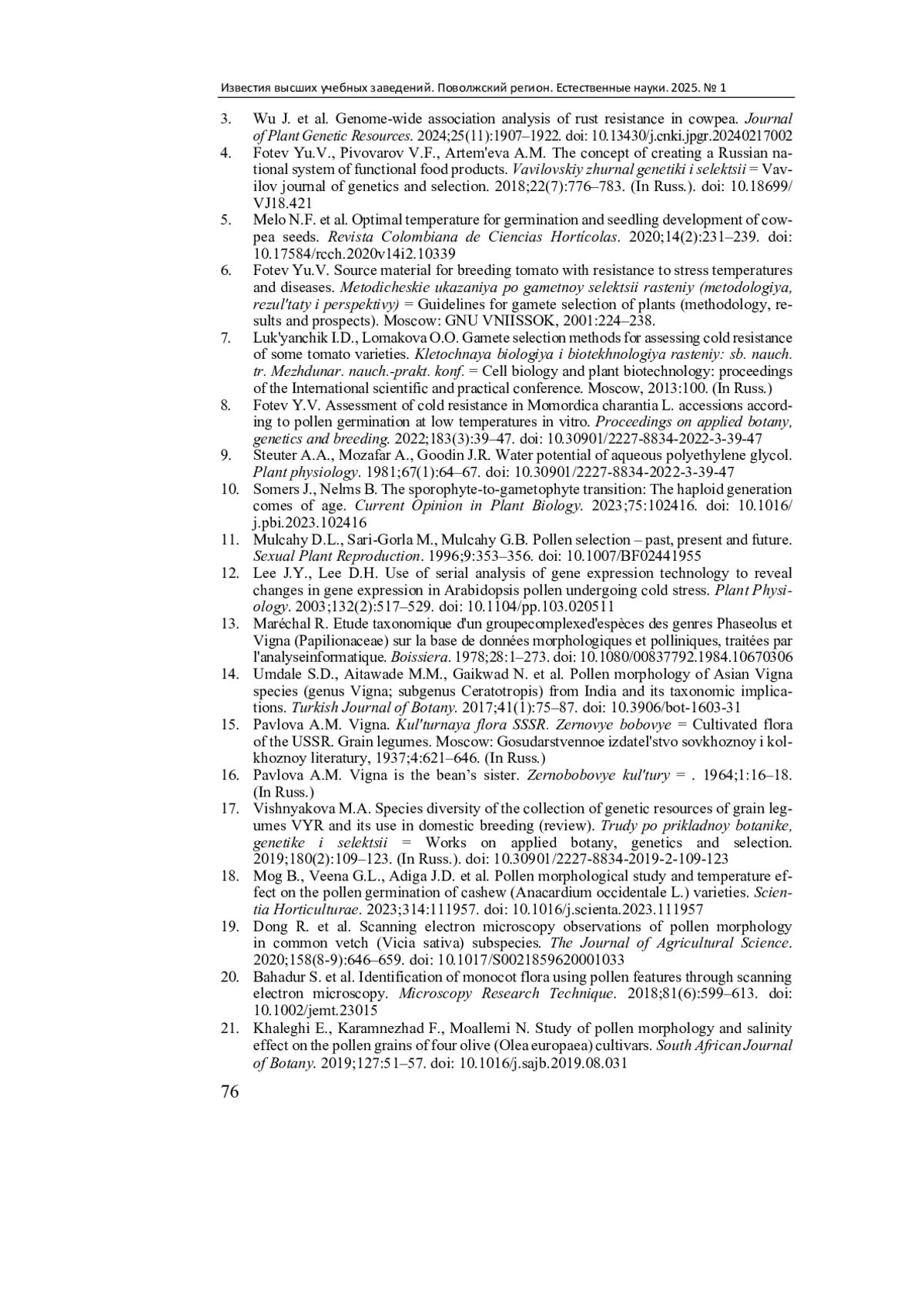 18. 	Mog B., Veena G. L., Adiga J. D. [et al.]. Pollen morphological study and temperature effect on the pollen germination of cashew (Anacardium occidentale L.) varieties // Scientia Horticulturae. 2023. Vol. 314. P. 111957. DOI: 10.1016/j.scienta.2023.111957