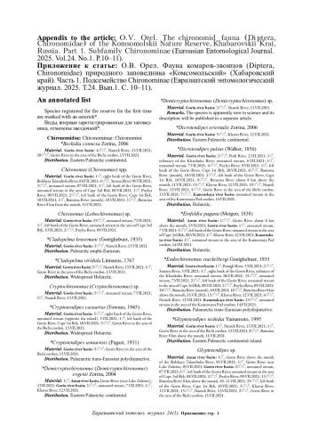 Приведены данные по фауне хирономид подсемейства Chironominae природного заповедника «Комсомольский» в виде аннотированного списка, основанного на изучении имагинального материала. Для водотоков и водоёмов заповедника зарегистрировано 57 видов из 27 родов, 2 триб. Обнаружено 3 новых для науки вида из родов Demicryptochironomus Lenz, 1941, Stenochironomus Kieff er, 1919 и Tanytarsus van der Wulp, 1874. Впервые для заповедника «Комсомольский» отмечено 39 видов. По типам распространения, из 49 достоверно определённых до вида хирономид, преобладают 28 палеарктических видов, составляющих 57 % от общего состава. Голарктических видов — 21, что составляет 43 % от общего состава видов. Наибольшее разнообразие комаров-звонцов подсемейства Chironominae зафиксировано в ручье без названия на левом берегу р. Горин — 29 видов, в реках Горин и Батурина по 23 и 19 видов соответственно.