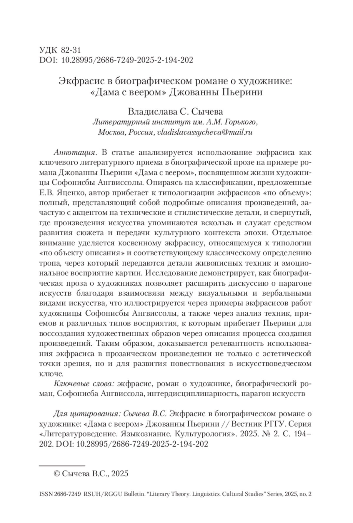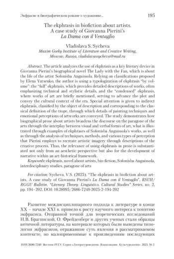СЫЧЕВА В. С. ЭКФРАСИС В БИОГРАФИЧЕСКОМ РОМАНЕ О ХУДОЖНИКЕ: «ДАМА С ВЕЕРОМ» ДЖОВАННЫ ПЬЕР // ВЕСТНИК РГГУ. СЕРИЯ «ЛИТЕРАТУРОВЕДЕНИЕ. ЯЗЫКОЗНАНИЕ. КУЛЬТУРОЛОГИЯ». 2025. № 2