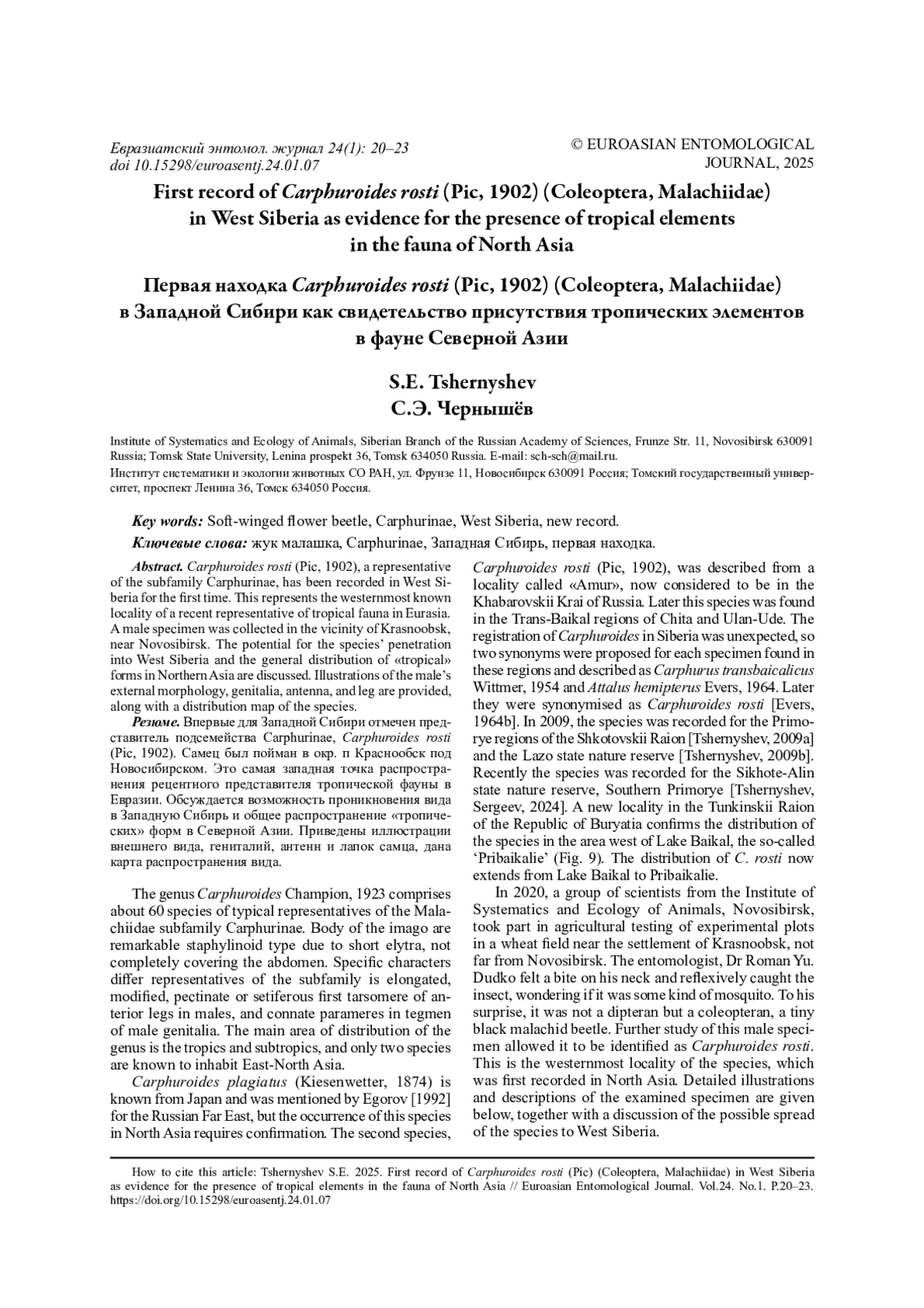 13. 	Tshernyshev S.E., Sergeev M.E. 2024. Soft-winged flower beetles (Coleoptera, Cleroidea: Malachiidae) of the Sikhote-Alinskii Nature Reserve, the Russian Far East // Euroasian Entomological Journal. Vol.23. No.6. P.337-341. DOI: 10.15298/euroasentj.23.06.07