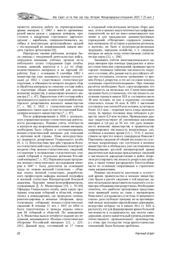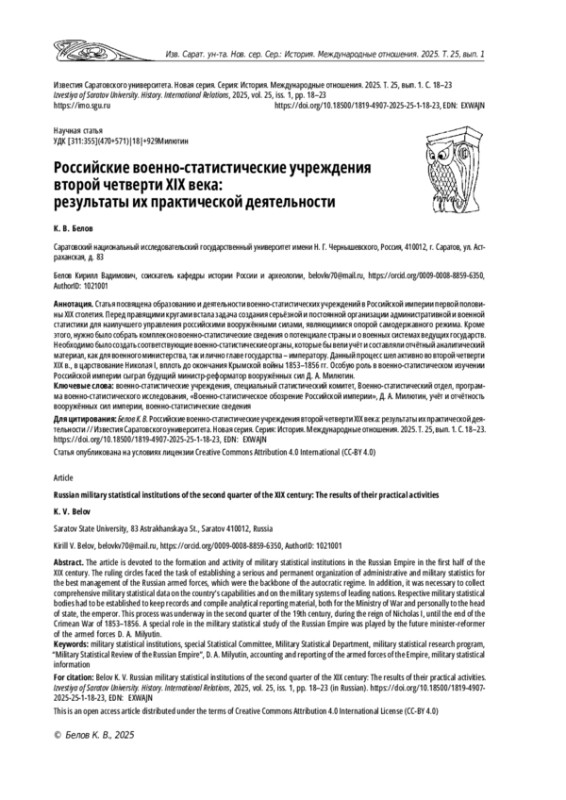 Статья посвящена образованию и деятельности военно-статистических учреждений в Российской империи первой половины XIX столетия. Перед правящими кругами встала задача создания серьёзной и постоянной организации административной и военной статистики для наилучшего управления российскими вооружёнными силами, являющимися опорой самодержавного режима. Кроме этого, нужно было собрать комплексно военно-статистические сведения о потенциале страны и о военных системах ведущих государств. Необходимо было создать соответствующие военно-статистические органы, которые бы вели учёт и составляли отчётный аналитический материал, как для военного министерства, так и лично главе государства – императору. Данный процесс шел активно во второй четверти XIX в., в царствование Николая I, вплоть до окончания Крымской войны 1853–1856 гг. Особую роль в военно-статистическом изучении Российской империи сыграл будущий министр-реформатор вооружённых сил Д. А. Милютин.