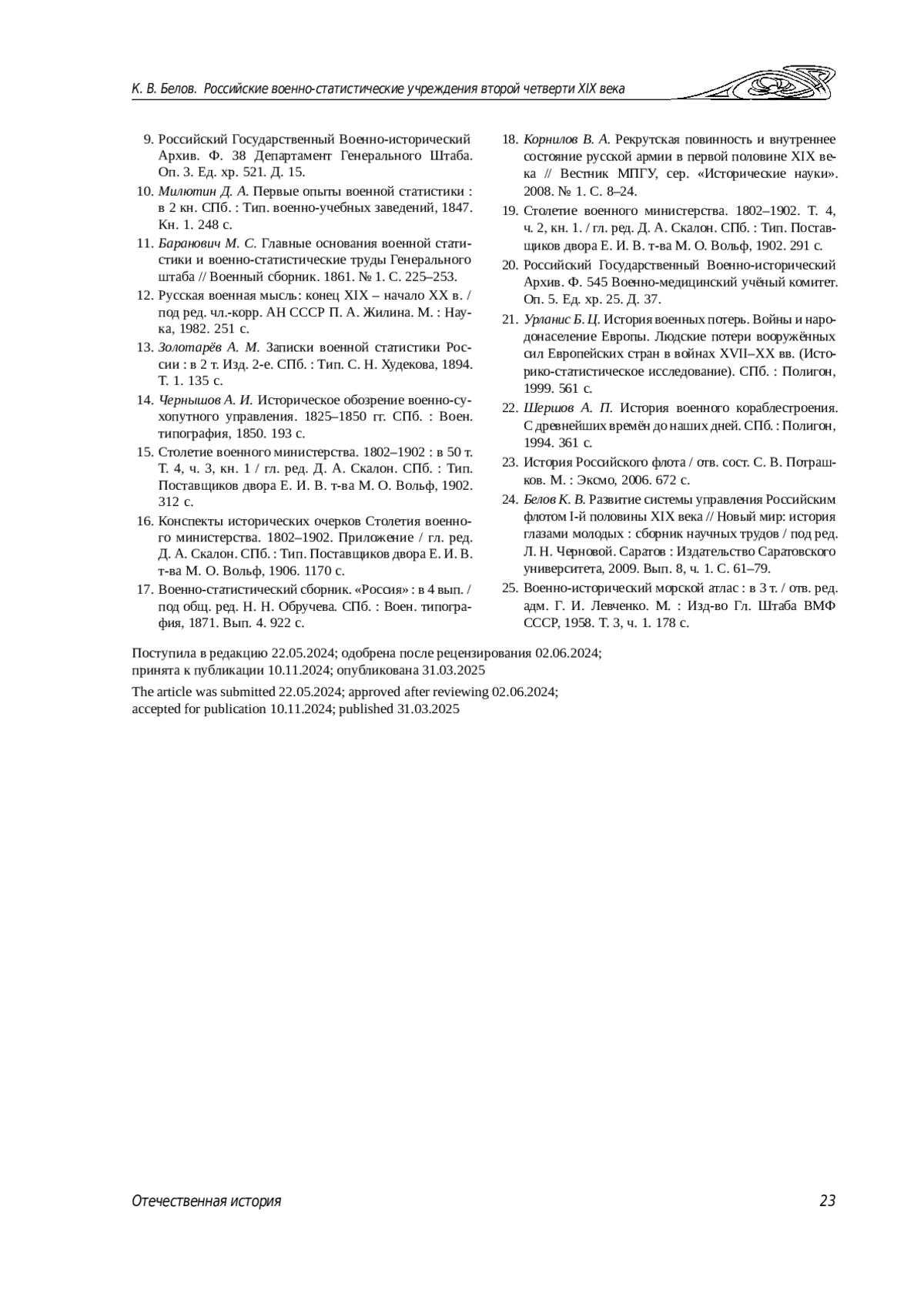 24. 	Белов К. В. Развитие системы управления Российским флотом I-й половины XIX века // Новый мир: история глазами молодых: сборник научных трудов / под ред. Л. Н. Черновой. Саратов: Издательство Саратовского университета, 2009. Вып. 8, ч. 1. С. 61-79.