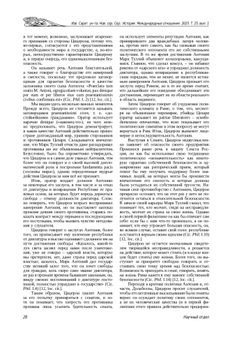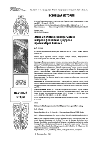 В статье рассматривается первая филиппика против Марка Антония в качестве источника, который раскрывает как определенные биографические обстоятельства в жизни Цицерона, так и его представления и идеалы, связанные с поведением политика. Анализ первой филиппики как политического действия, подобного тому, которое Цицерон совершил в начале своей карьеры, защищая в суде Секста Росция Америйского, позволяет рассмотреть его взаимоотношения с Марком Антонием в динамике и определить, каким образом филиппики как реальное политическое действие соотносятся с представлениями о политике, транслировавшимися Цицероном.