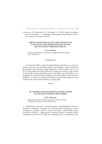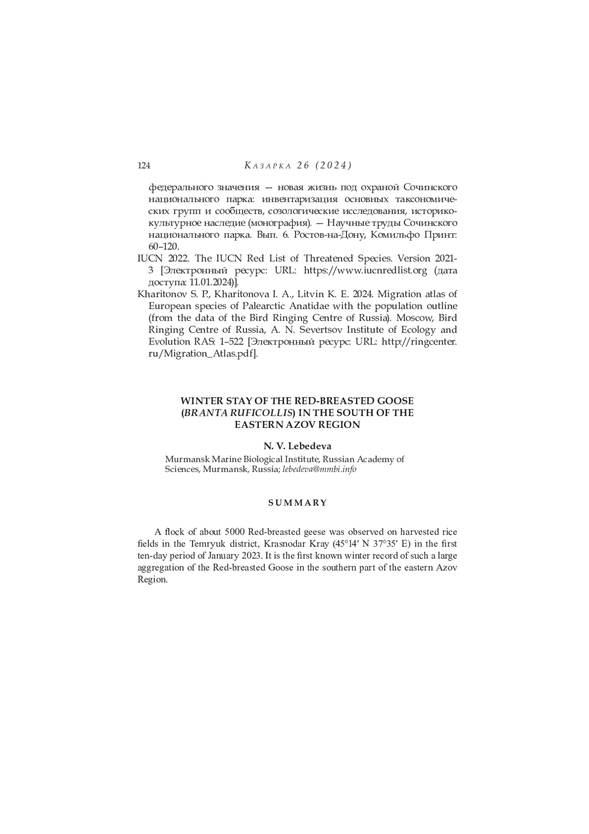 9. 	Kharitonov S. P., Kharitonova I. A., Litvin K. E. 2024. Migration atlas of European species of Palearctic Anatidae with the population outline (from the data of the Bird Ringing Centre of Russia). Мoscow, Bird Ringing Centre of Russia, A. N. Severtsov Institute of Ecology and Evolution RAS: 1-522 [Электронный ресурс: URL: http://ringcenter.ru/Migration_Atlas.pdf].