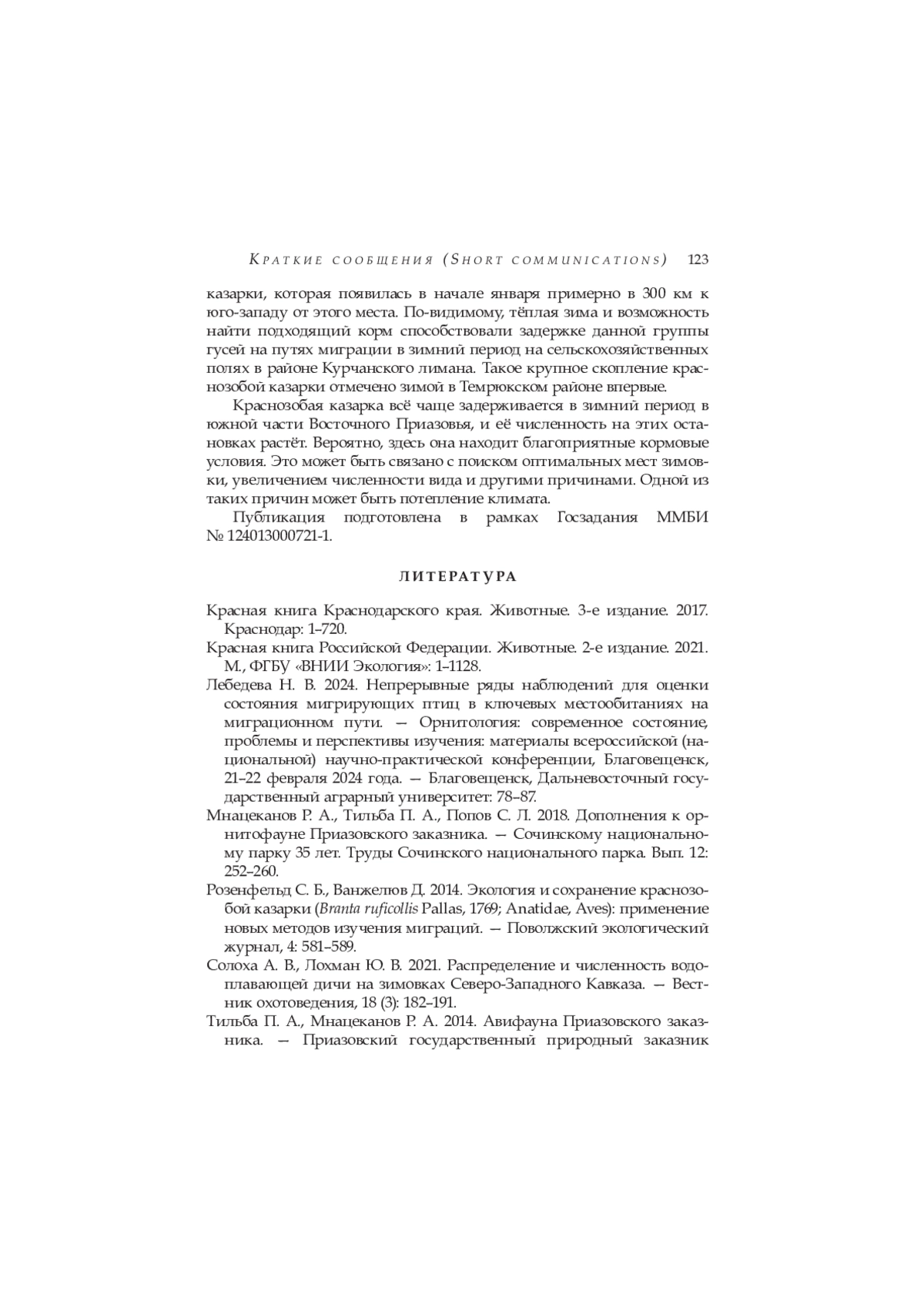 6. 	Солоха А. В., Лохман Ю. В. 2021. Распределение и численность водоплавающей дичи на зимовках Северо-Западного Кавказа. - Вестник охотоведения, 18 (3): 182-191.